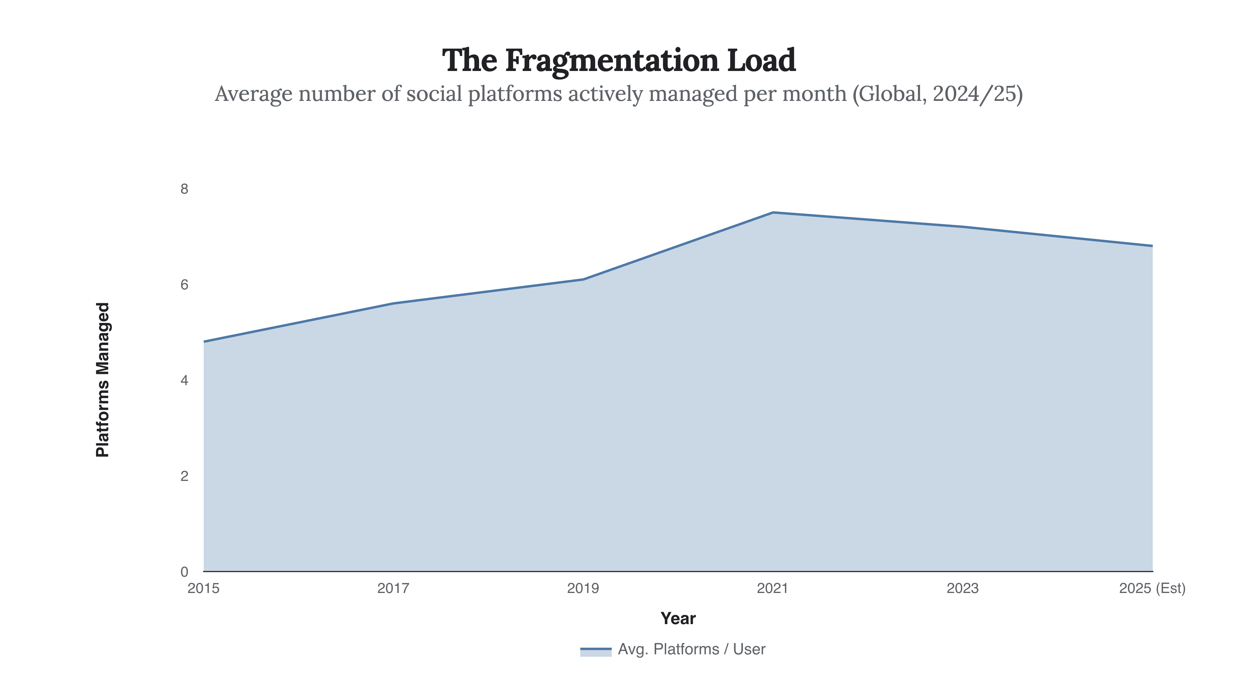 Note the stabilization around 6.8 to 7 platforms. This suggests a “Cognitive Ceiling”—the maximum number of distinct personas a human mind can plausibly maintain before performance degrades significantly. We have hit peak fragmentation; the next phase is rationalization.