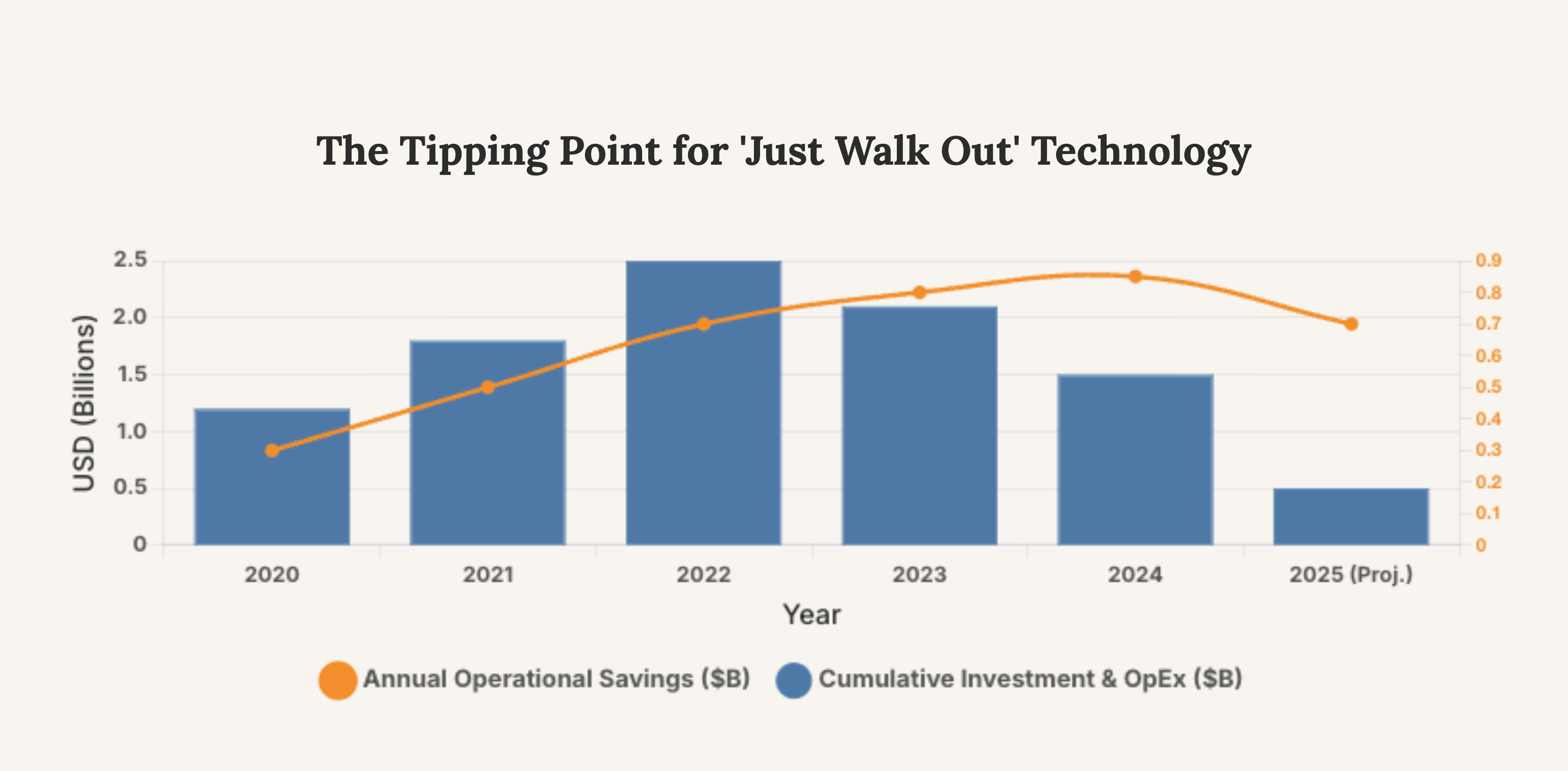 Caption: This combo chart models the financial dynamics of the ‘Just Walk Out’ initiative. The analysis shows that despite rising operational savings, the cumulative investment and operating expenditures required to scale the technology created an unsustainable financial burden, prompting the strategic disinvestment.
