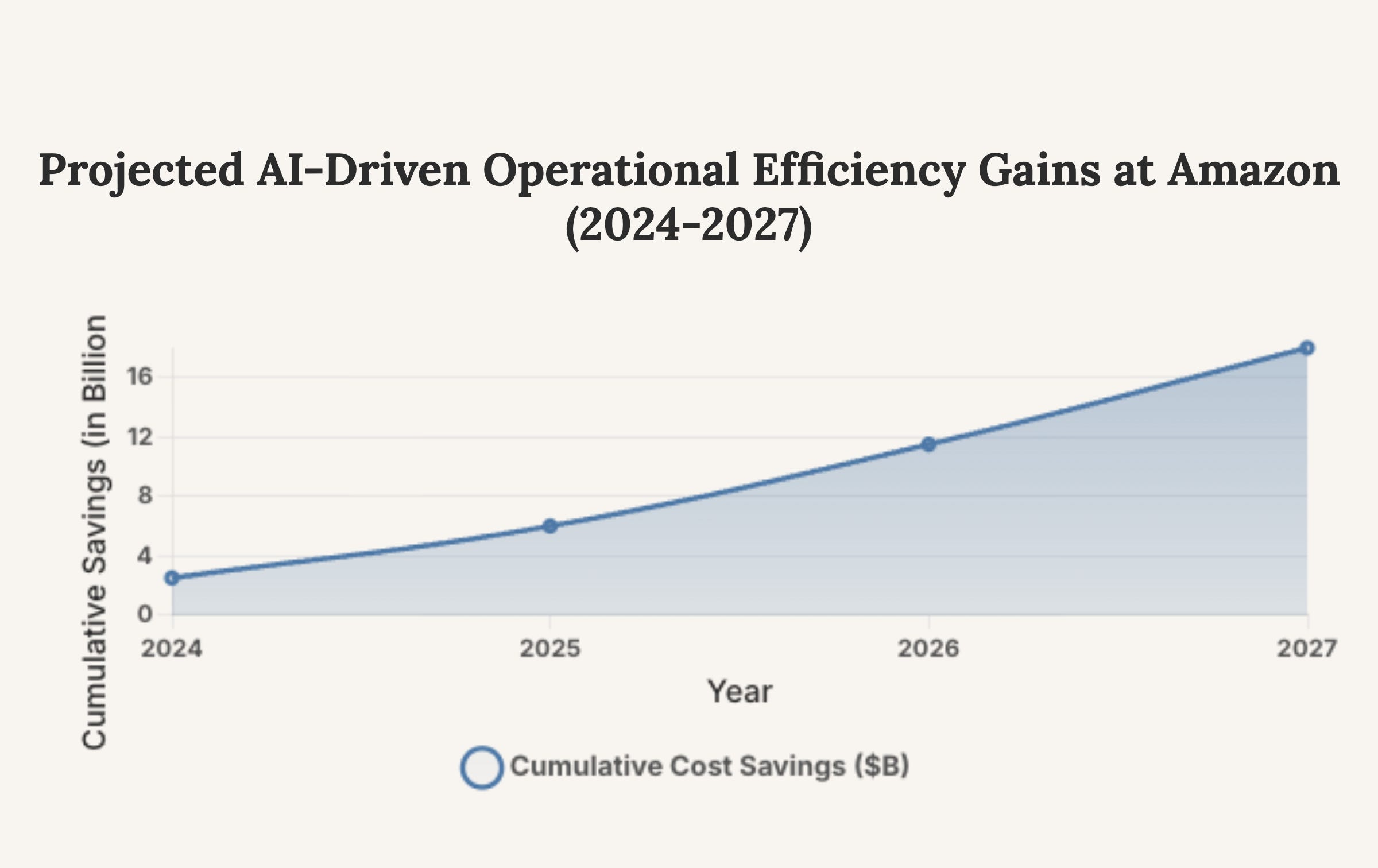 Caption: This area chart projects the significant, compounding operational cost savings Amazon is likely to achieve by deploying generative AI across its logistics, customer service, and corporate functions. These savings will provide a continuous funding stream for further AI R&D.