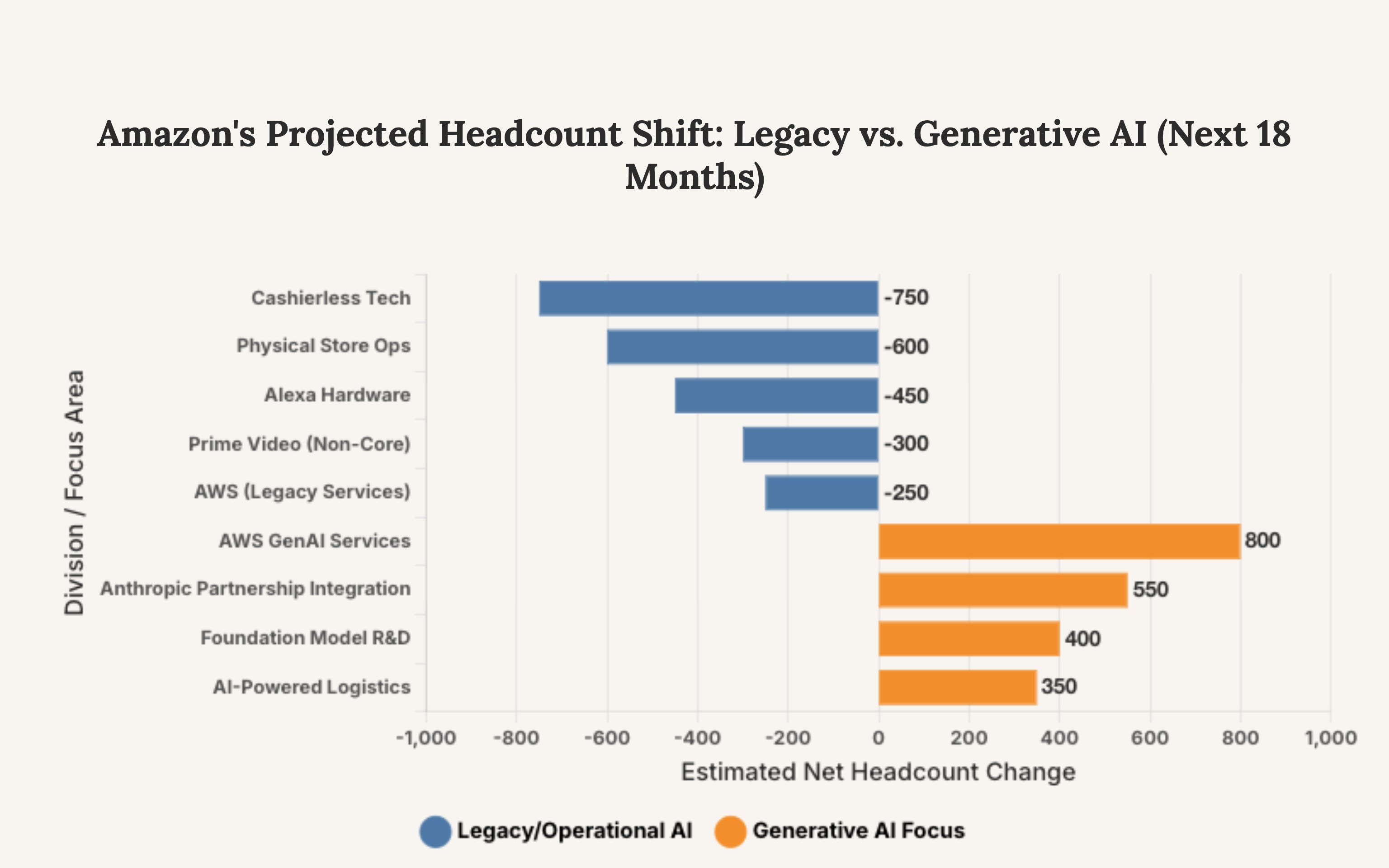 Caption: This chart projects the estimated realignment of Amazon’s technical workforce. The data illustrates a significant reduction in roles tied to operational AI like physical retail systems, with a corresponding surge in hiring for roles directly involved in developing and deploying generative AI.