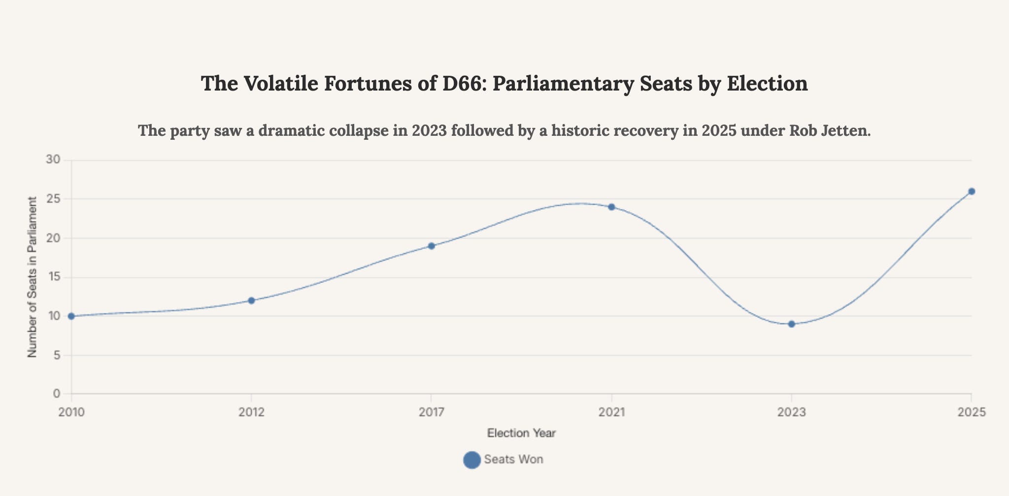 The historical data paints a clear picture of D66’s rollercoaster journey. After reaching a high of 24 seats in 2021, the party crashed to just 9 in 2023, its worst result in 17 years. The 2025 result under Jetten is not just a recovery; it is the party’s best performance in its history, a stunning reversal that has reshaped the Dutch political landscape. Jetten took leadership of the party in August 2023, inheriting a movement at its nadir and leading it back to national prominence in just over two years.