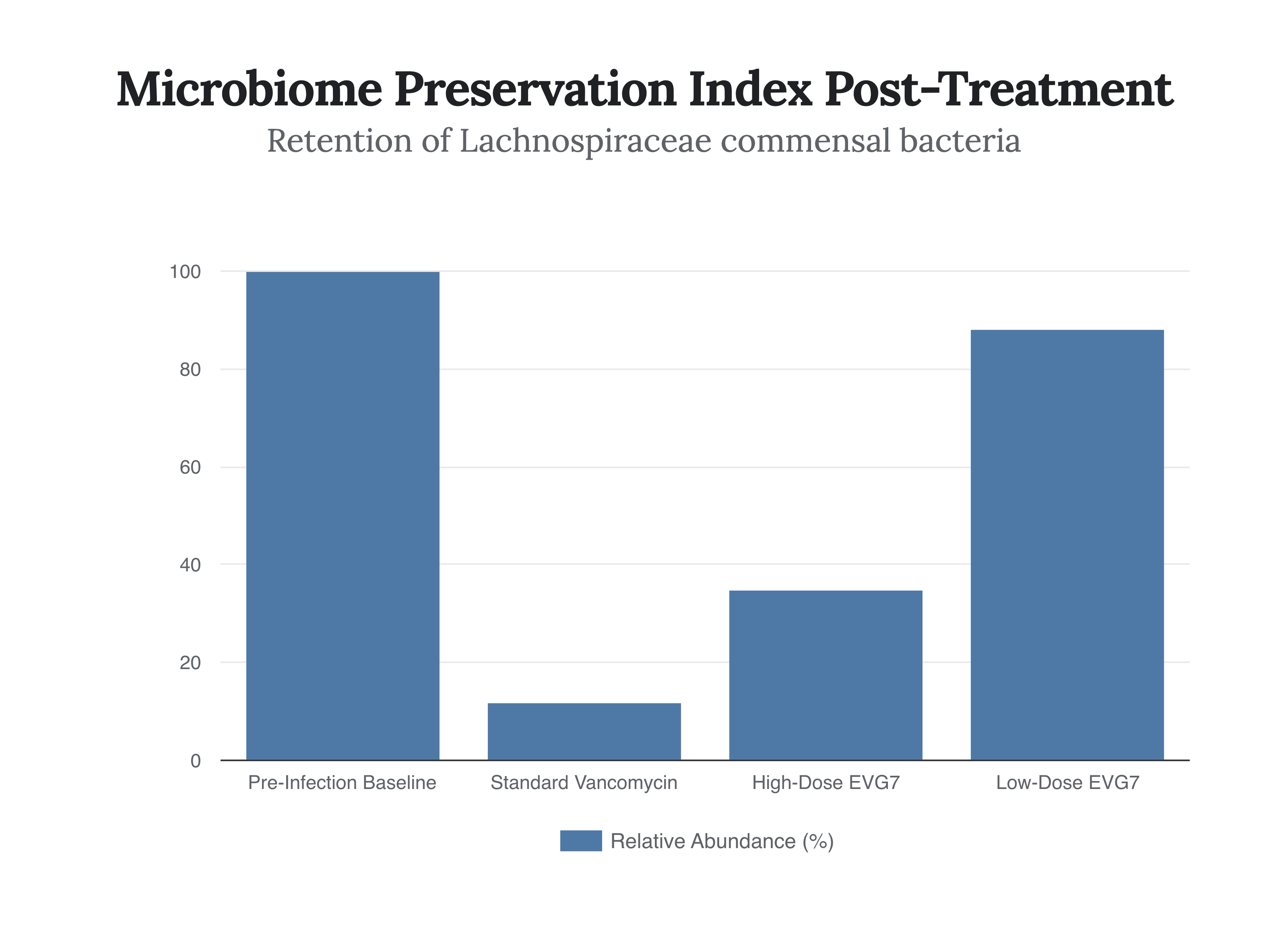 Members of the Lachnospiraceae family are key producers of short-chain fatty acids (SCFAs), most notably butyrate. Butyrate serves as the primary energy source for colonocytes (the cells lining the colon), maintaining the structural integrity of the gut barrier and suppressing systemic inflammation. More importantly, the presence of these commensal bacteria creates intense competition for physical adherence sites and vital nutrients within the gut lumen, a phenomenon known as colonization resistance. When EVG7 selectively spares Lachnospiraceae, it effectively conscripts a biological army to guard the territory immediately after the active C. diff cells are neutralized. The Game Theory payoff matrix for the host is fundamentally transformed. Instead of emerging from treatment as a barren, defenseless landscape highly susceptible to reinvasion, the host emerges with an intact, aggressively territorial indigenous flora. EVG7 weaponizes the patient’s own microbiome, turning a passive biological ecosystem into an active, Non-Zero-Sum defensive perimeter against pathogen resurgence. This alliance ensures that the immediate clinical victory over the active infection is translated into permanent, long-term stability, dramatically altering the epidemiological trajectory of the disease.