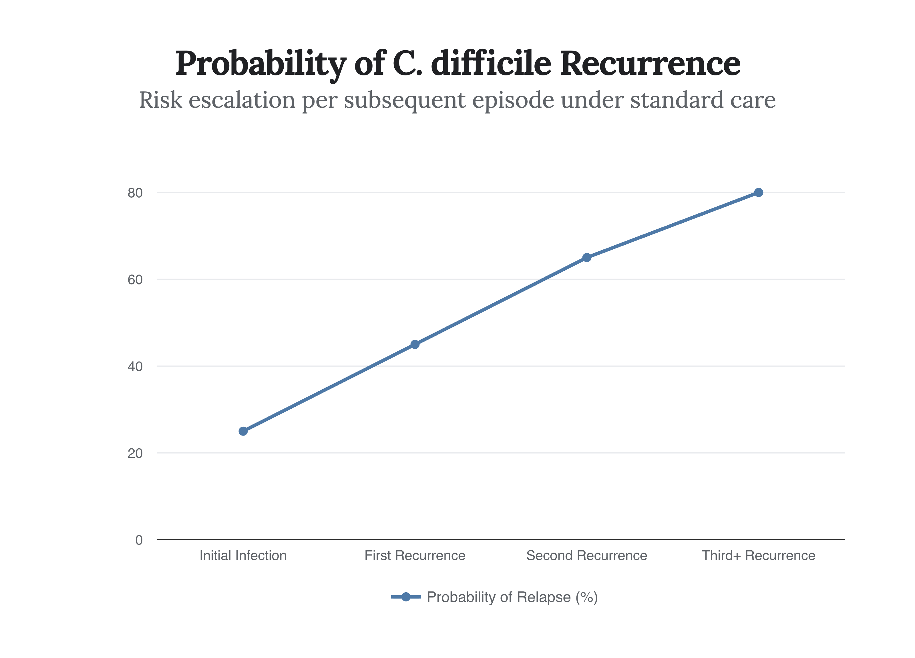 The true strategic failure of the current standard of care lies in the recurrence trap. Between 25% and 30% of all patients treated for an initial CDI episode with frontline therapies like vancomycin or fidaxomicin will experience a recurrent infection (rCDI) within weeks of completing their antibiotic course. With each subsequent relapse, the probability of yet another recurrence increases exponentially, creating a vicious, compounding loop of illness. In Game Theory, this scenario mirrors an Iterated Prisoner’s Dilemma played between the healthcare system and the pathogen. The hospital attempts to ‘cooperate’ with the patient’s recovery by deploying standard antibiotics. The pathogen, however, consistently ‘defects’ by retreating into dormant spores during the pharmacological assault, only to aggressively reactivate once the drug concentration falls below the minimum inhibitory threshold. Because the host’s indigenous microbiome has been obliterated by the treatment, the germinating C. diff spores face zero ecological competition, allowing them to rapidly reclaim dominance. Recurrent C. difficile is not merely a clinical failure; it is a compounding financial contagion that systemically drains hospital profitability under modern value-based care reimbursement models. Under these models, hospitals are heavily penalized for readmissions occurring within 30 days of discharge. A single episode of rCDI can easily consume upwards of $35,000 in unreimbursed critical care costs, annihilating the operating margins of the treating facility and transforming a treatable infection into a systemic financial liability.