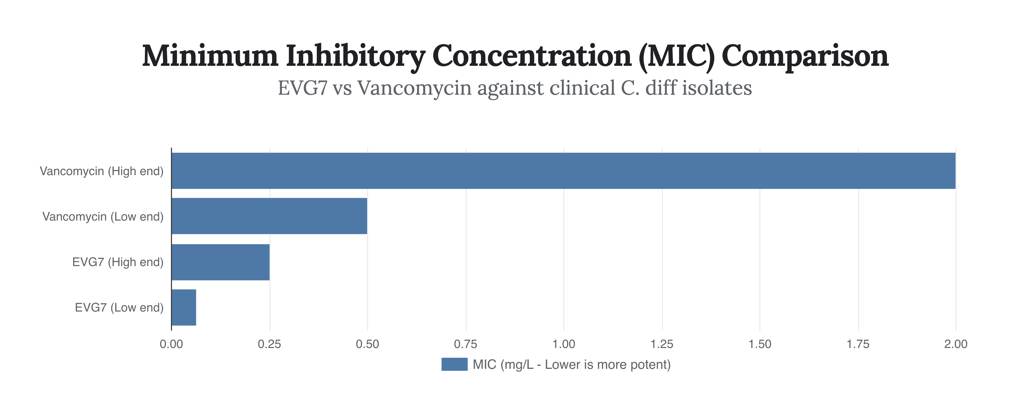 The quantitative validation of this molecular asymmetry is found in the Minimum Inhibitory Concentration (MIC) data published in Nature Communications in October 2025. In rigorous in vitro susceptibility assays, clinical isolates of C. difficile were proven to be up to 16 times more sensitive to EVG7 than to legacy vancomycin. Specifically, the MIC for EVG7 ranges from an astonishingly low 0.063 to 0.25 mg/L, compared to the 0.5 to 2 mg/L required for vancomycin. This exponential increase in potency constitutes a overwhelming Credible Threat in the strategic interactions between the host and the pathogen. A Credible Threat in Game Theory is a conditional strategy that is demonstrably enforceable; EVG7’s massive binding affinity guarantees that even trace concentrations of the drug will aggressively neutralize active C. diff vegetative cells. By achieving a 16-fold increase in binding affinity, EVG7 transforms vancomycin from a blunt, untargeted instrument into a molecularly guided biological munition. This hyper-potency is the critical prerequisite for the downstream strategic advantages of the drug. Because it is so intensely lethal to the target pathogen at microscopic concentrations, researchers were empowered to drastically alter the entire dosing paradigm, unlocking a secondary, immensely powerful ecological effect that standard antibiotics cannot safely achieve.