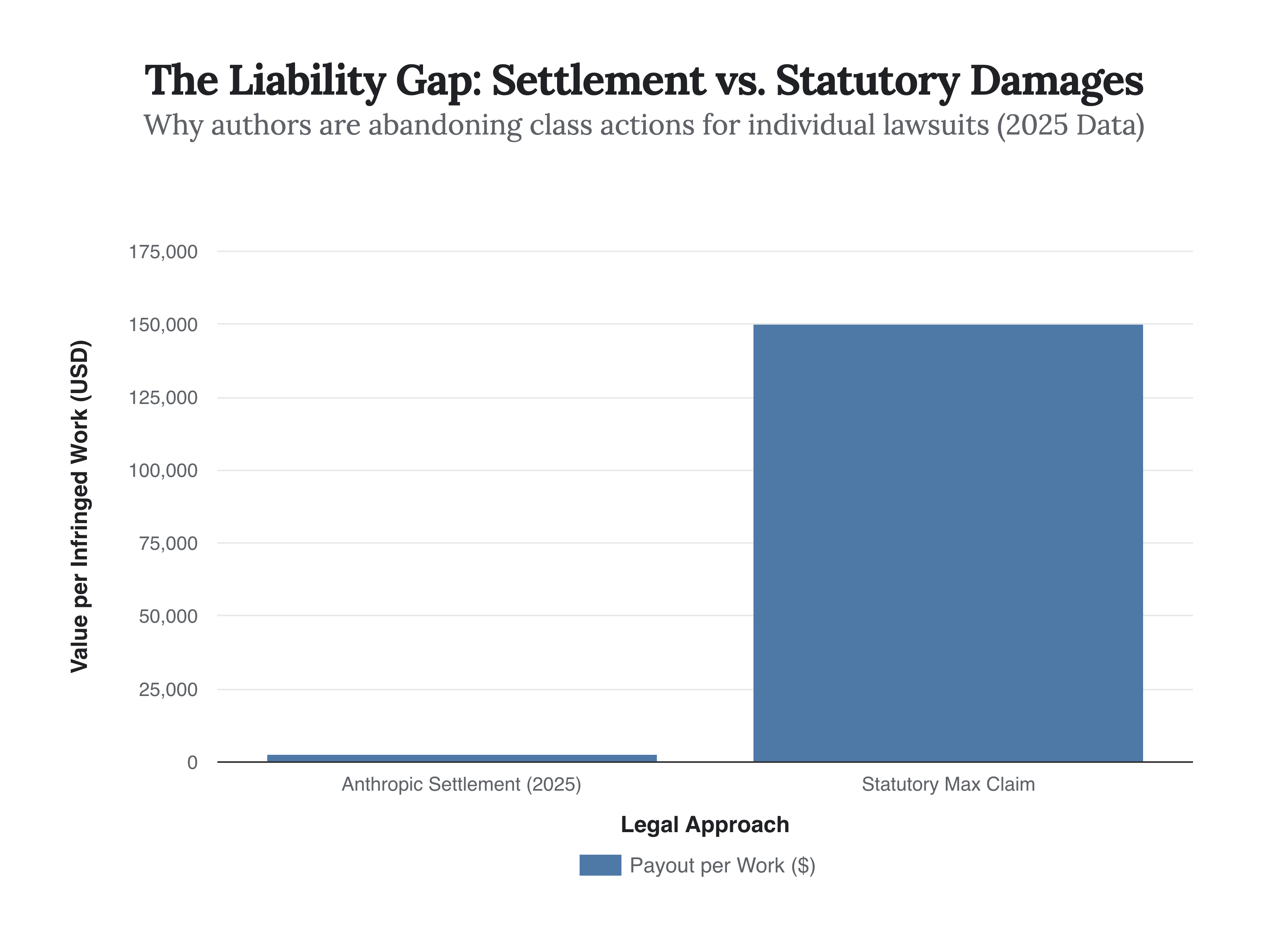 The chart above illustrates the stark economic disparity driving this new legal strategy. In August 2025, Anthropic settled a major class-action lawsuit for $1.5 billion. While the headline number was large, the actual payout to individual authors averaged roughly $3,000 per book—a mere 2% of the potential damages allowed under the Copyright Act. Carreyrou’s lawsuit explicitly cites this “bargain-basement” rate as the reason for opting out of the class-action model. If this strategy succeeds, the potential liability for companies like Google and OpenAI could skyrocket from billions to trillions, depending on the number of works proven to be ingested.