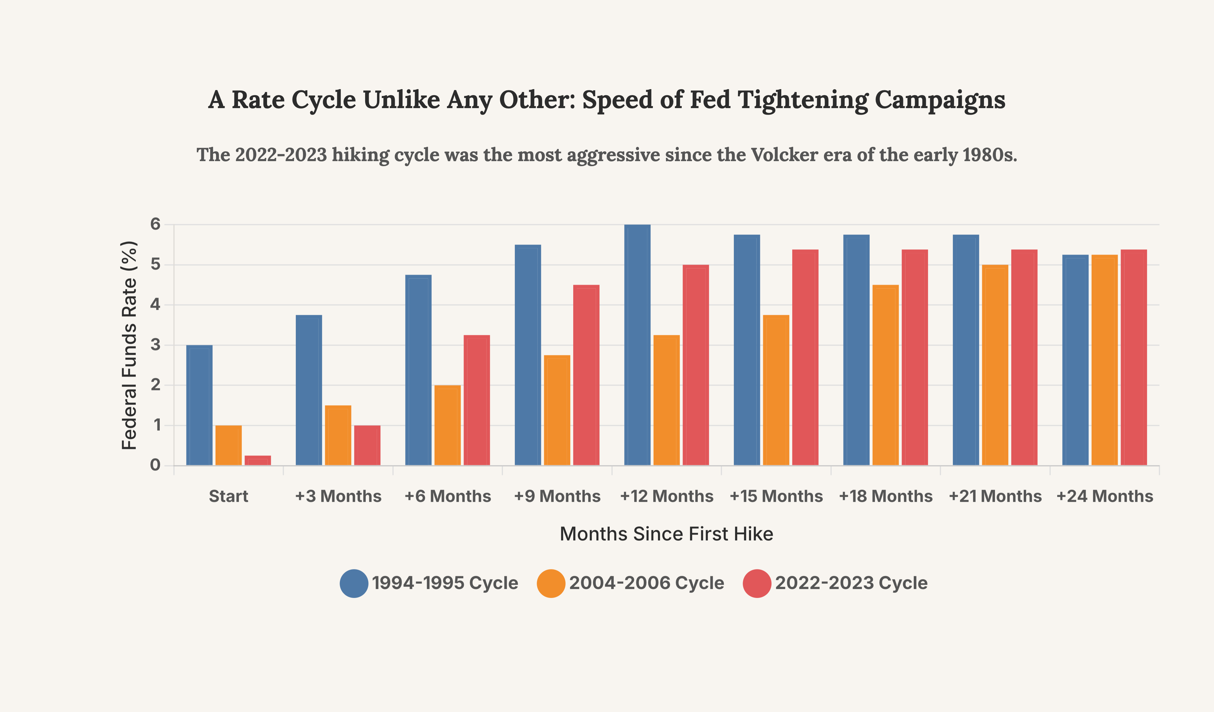 This chart provides critical context, showing the sheer velocity of the recent tightening. The speed of the ascent explains the Fed’s current cautious approach, as the full economic impact of these hikes may not yet be fully realized.