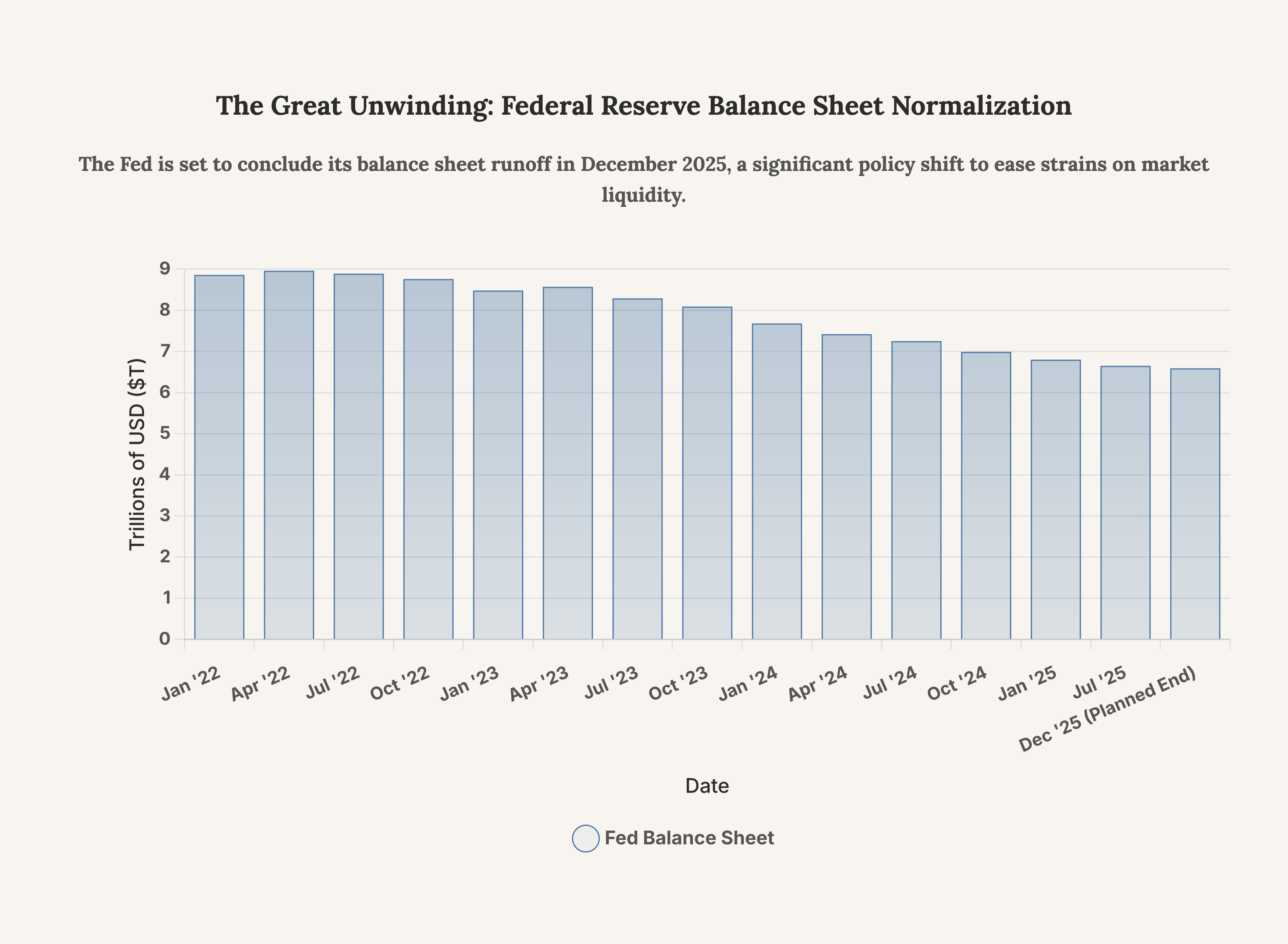 Compounding the complexity of the rate pivot is another monumental shift in policy: the conclusion of Quantitative Tightening (QT). The Fed announced it will end the reduction of its massive securities portfolio on December 1, 2025. This decision was driven by emerging strains in short-term funding markets, where the process of QT was removing liquidity and putting upward pressure on overnight rates.