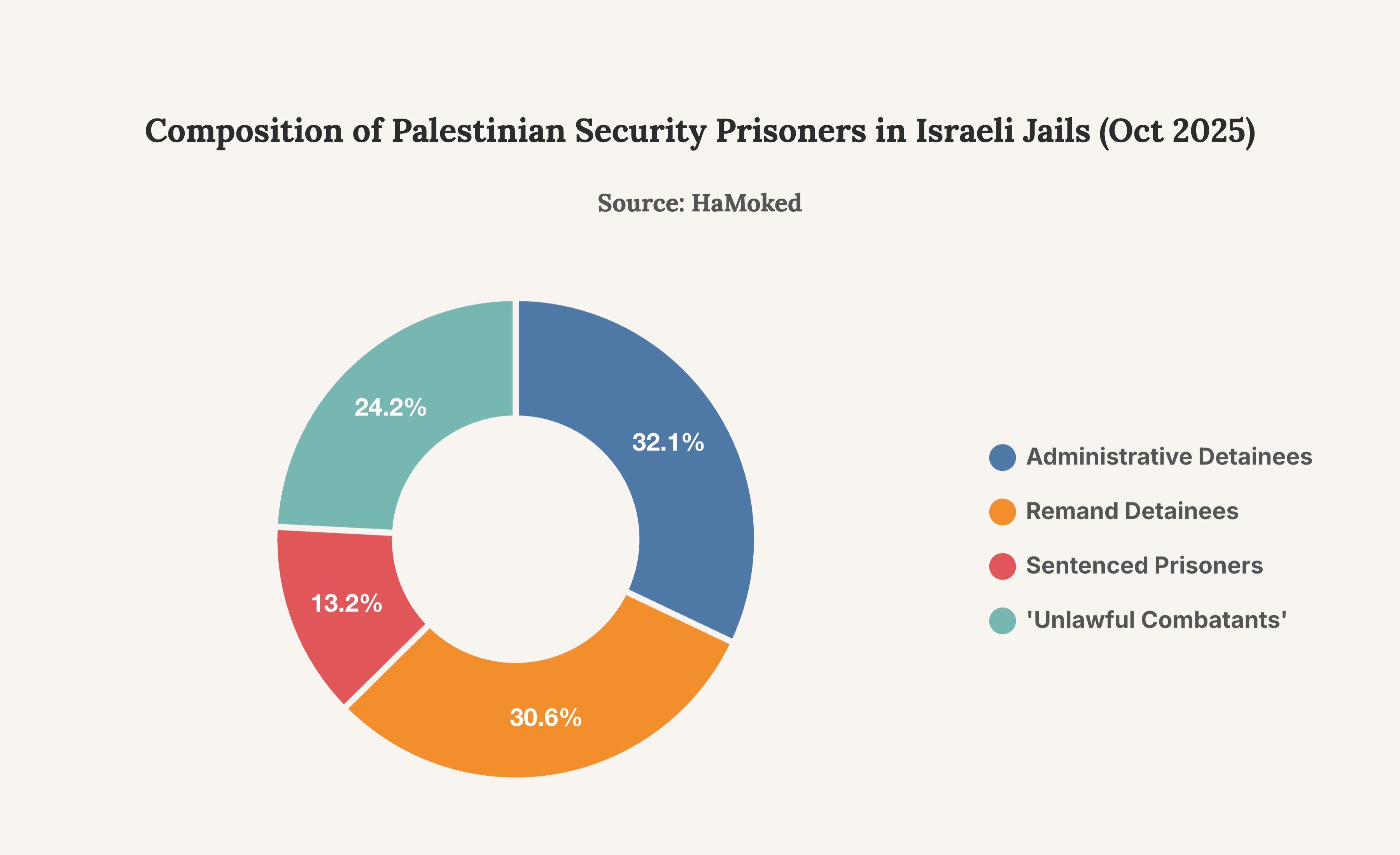 Caption: This chart breaks down the population of Palestinian security prisoners held by Israel. A significant portion are administrative and remand detainees held without a final conviction, a point of major contention. Hamas prioritizes the release of the ‘Sentenced Prisoners’ group, which includes many convicted of violent attacks.