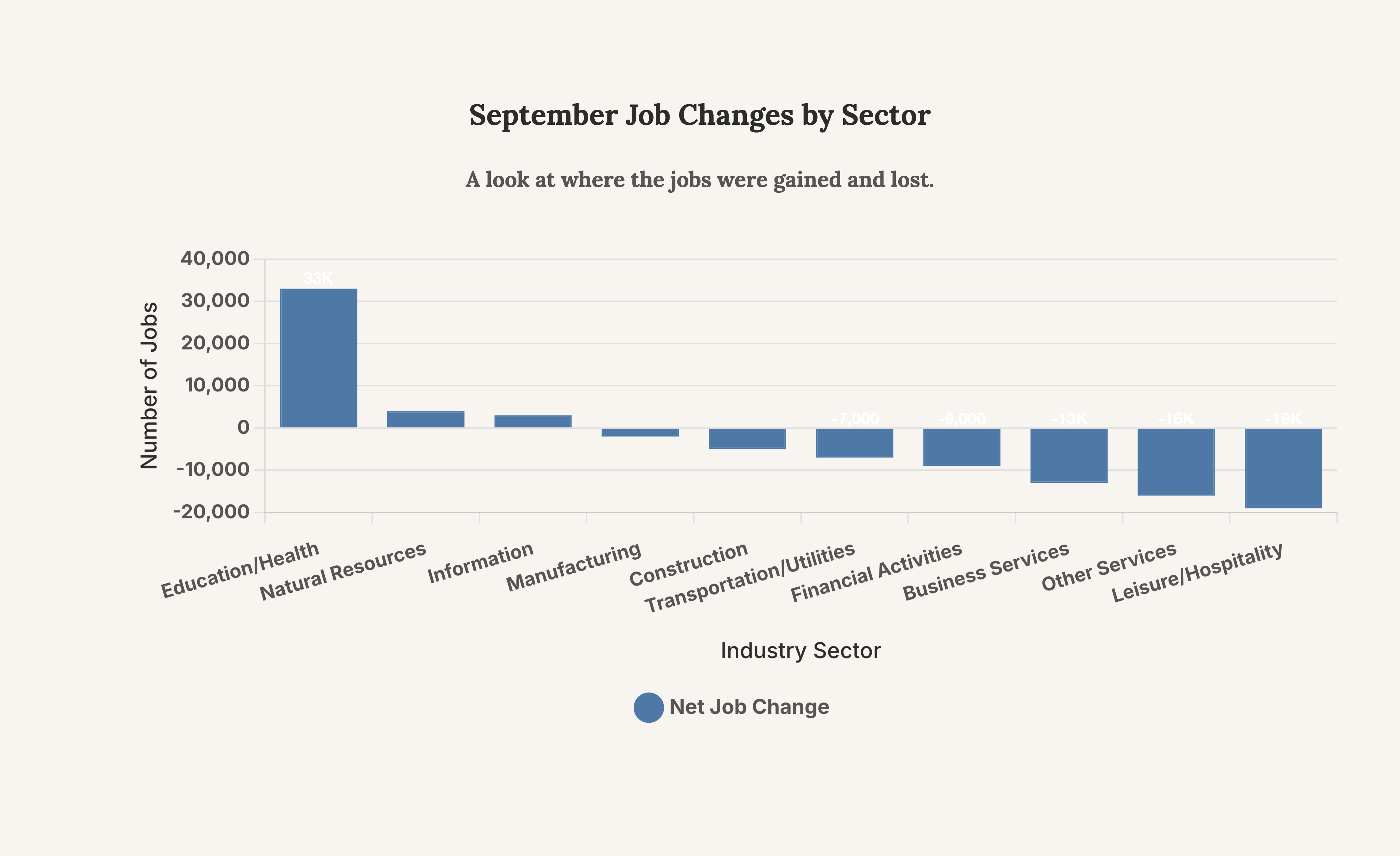 The detailed breakdown for September 2025 reveals a fractured labor market. The gains in healthcare and education were not enough to offset the significant declines in consumer-facing and professional service industries, leading to an overall net loss for the month.