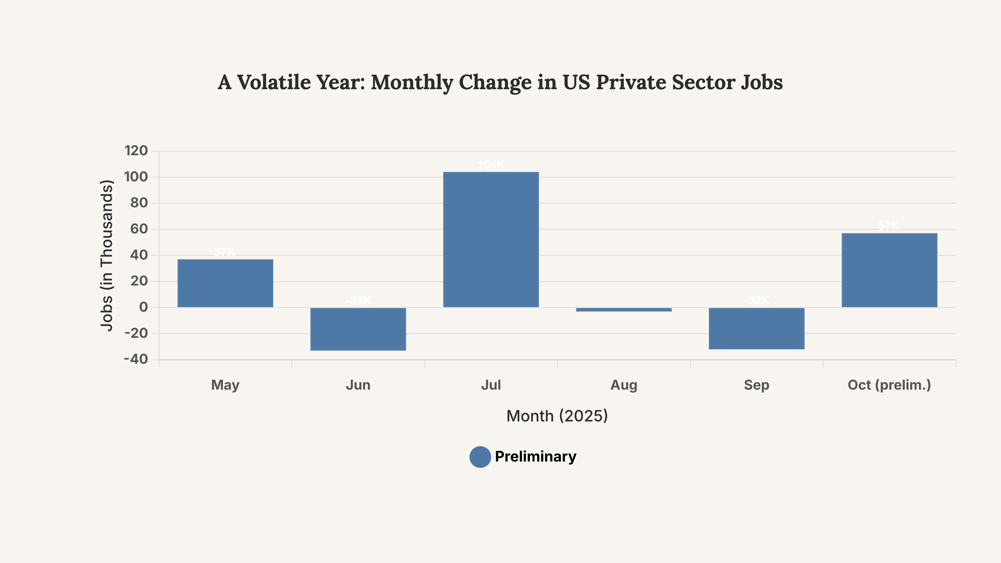 This chart illustrates the month-to-month volatility in private-sector job creation throughout 2025. The preliminary October figure is calculated by multiplying the new weekly average of 14,250 by four weeks. The data reveals a period of swings between modest gains and significant losses, highlighting the uncertainty employers have faced.