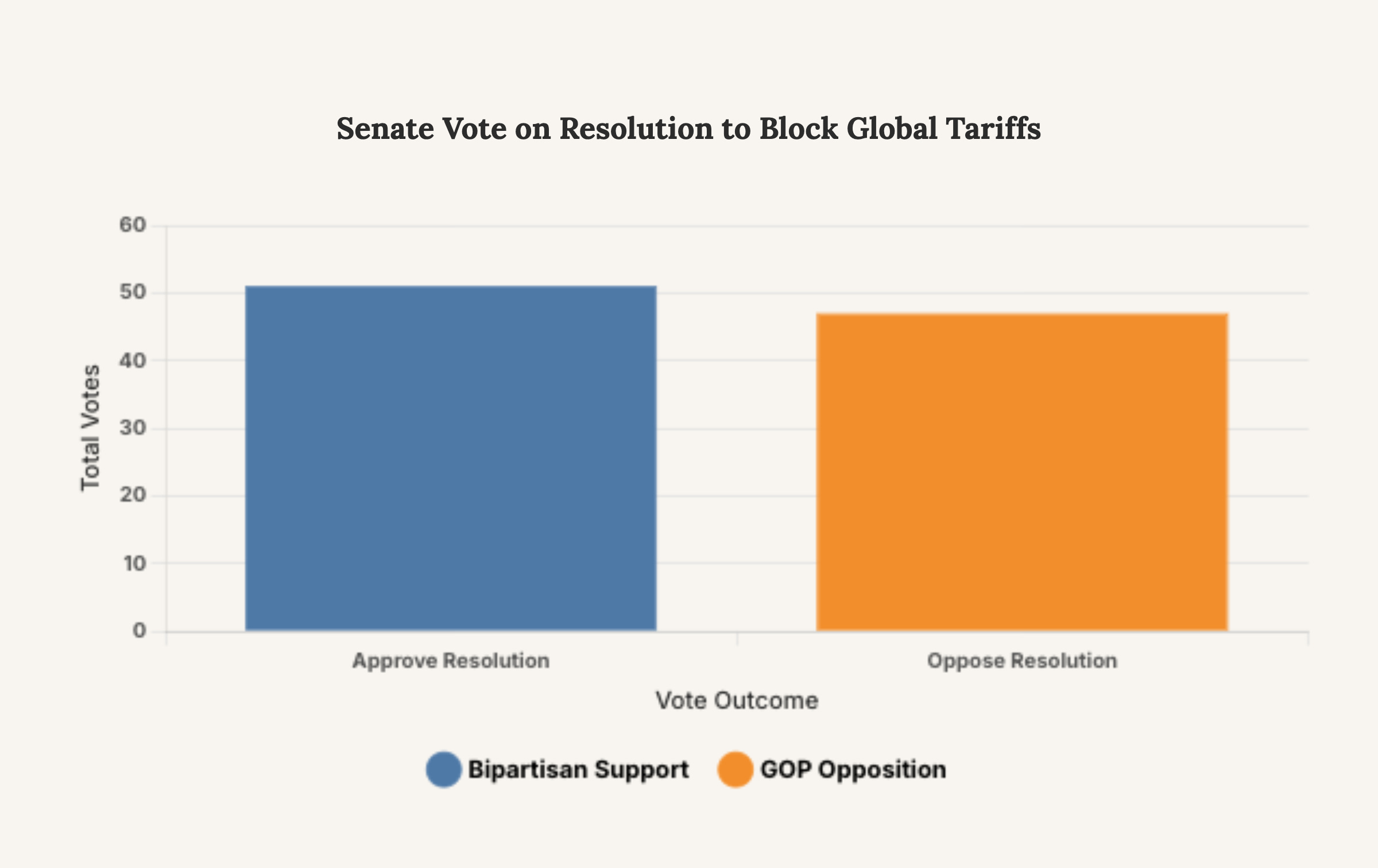 This chart illustrates the narrow margin of the Senate’s vote to disapprove of the President’s global tariffs, highlighting the bipartisan nature of the dissent.
