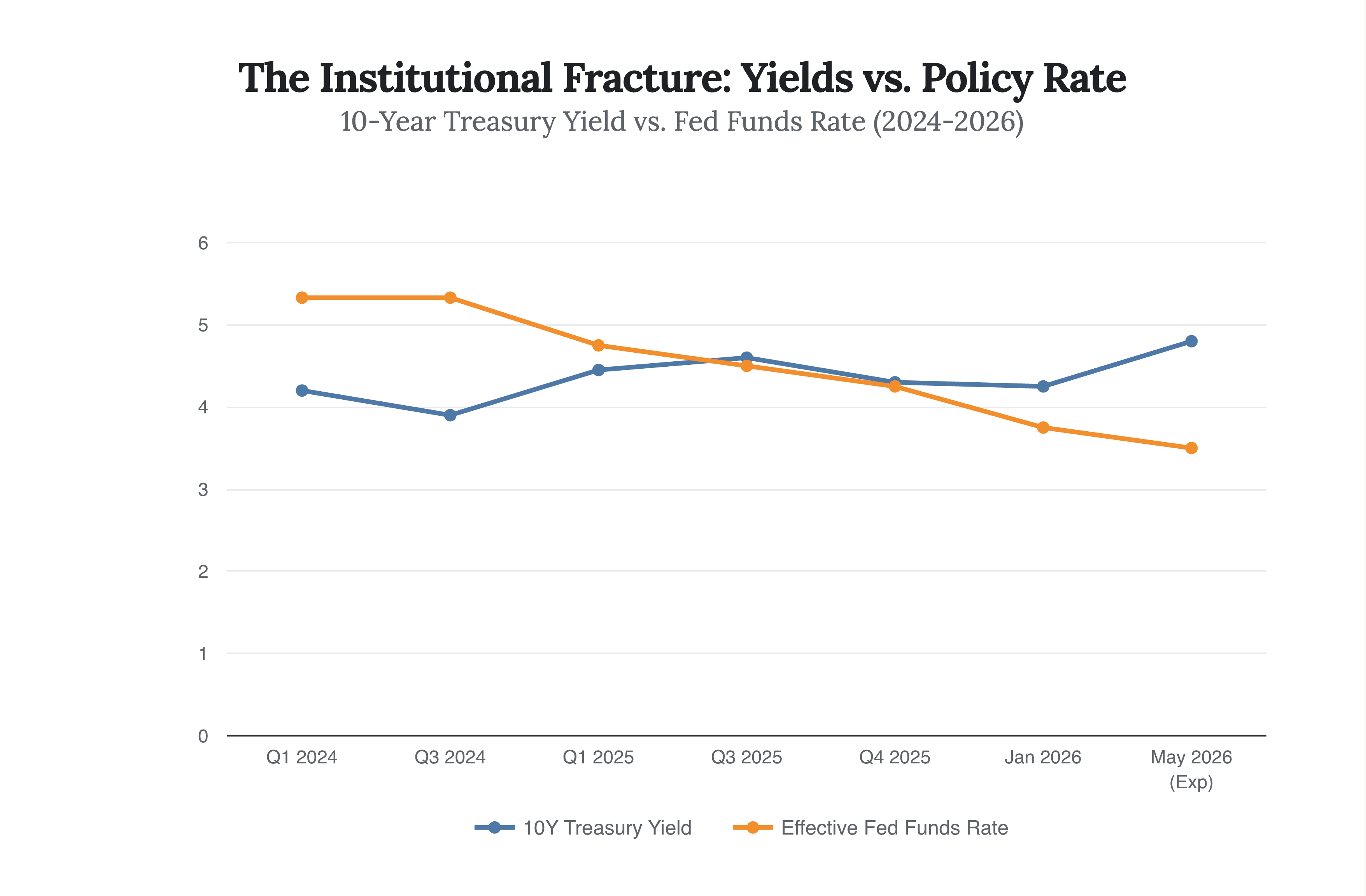 Why? Because the bond market is a legalist mechanism. It recognizes statutory authority, not political proximity. As long as Powell held the gavel of the FOMC, the Shadow Chair was noise. The persistence of the 10-year yield at 4.25% in January 2026—despite the Fed Funds rate being cut to 3.75%—was the market’s vote of no confidence in the future inflation regime. The spread between the policy rate and the long bond was widening, signaling that the market expected the “Trump Rate Cut” to be inflationary.