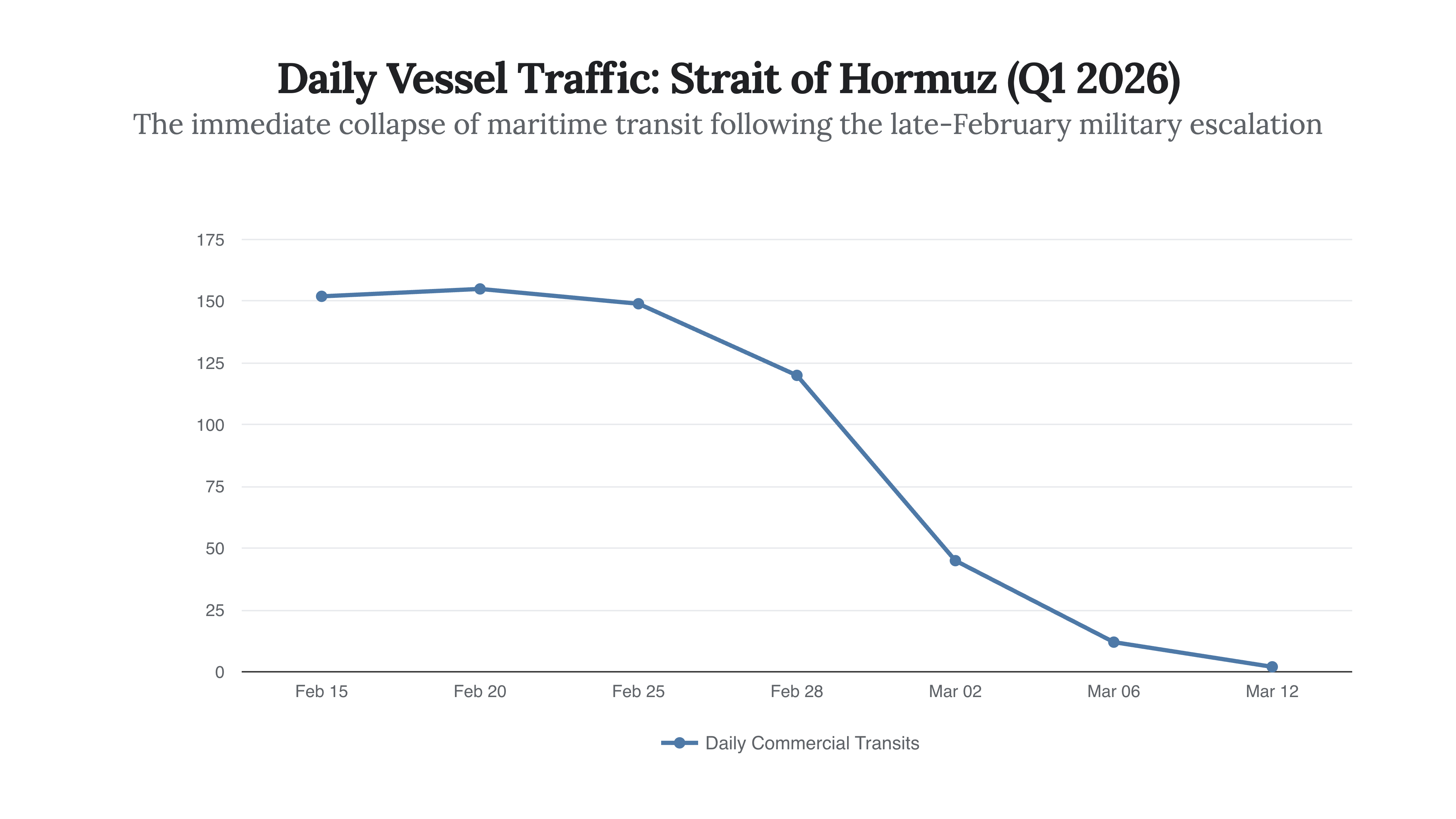 To understand the sheer magnitude of this crisis, we must look at the hard data from Q1 2026. Prior to the escalation, the strait facilitated the transit of approximately 20 million barrels per day (mb/d) of crude oil and petroleum liquids, accounting for roughly 20% to 25% of all global seaborne oil trade. In tandem, it carried over 112 billion cubic meters (bcm) of liquefied natural gas (LNG) annually, predominantly from Qatar and the UAE, representing roughly 20% of total global LNG trade. In a matter of days, the corridor transitioned from a bustling superhighway averaging 153 daily vessel transits to a militarized ghost town. Following explicit warnings from the Islamic Revolutionary Guard Corps (IRGC) and subsequent strikes on commercial vessels, tanker traffic has dropped to near absolute zero.