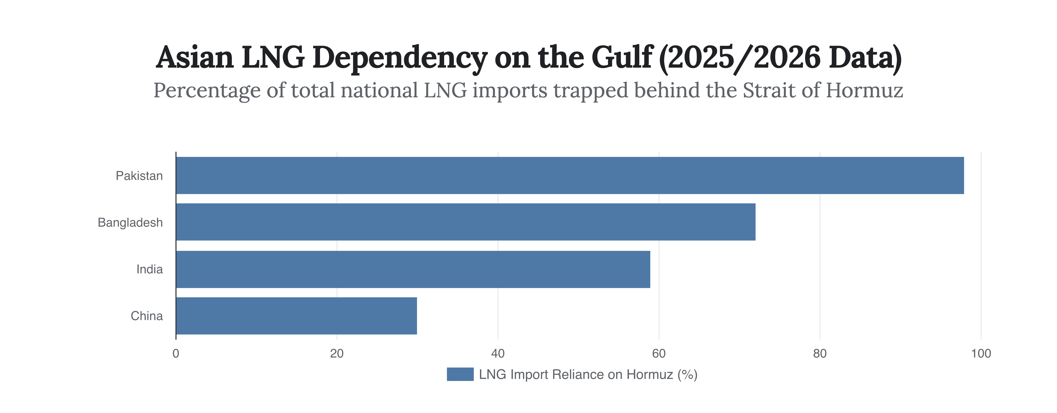 The asymmetric impact here will redraw geopolitical alliances. Europe, having severed itself from Russian pipeline gas, now relies on Qatar for 12% to 14% of its total LNG imports. The loss of this supply heading into the injection season guarantees extreme price volatility across the continent. However, the true catastrophe falls on the developing economies of South Asia. According to Q1 2026 data, Pakistan is reliant on Qatar for 98% of its LNG imports. Bangladesh depends on the Gulf for nearly 75% of its supply. India sources 59% of its LNG from Qatar and the UAE.