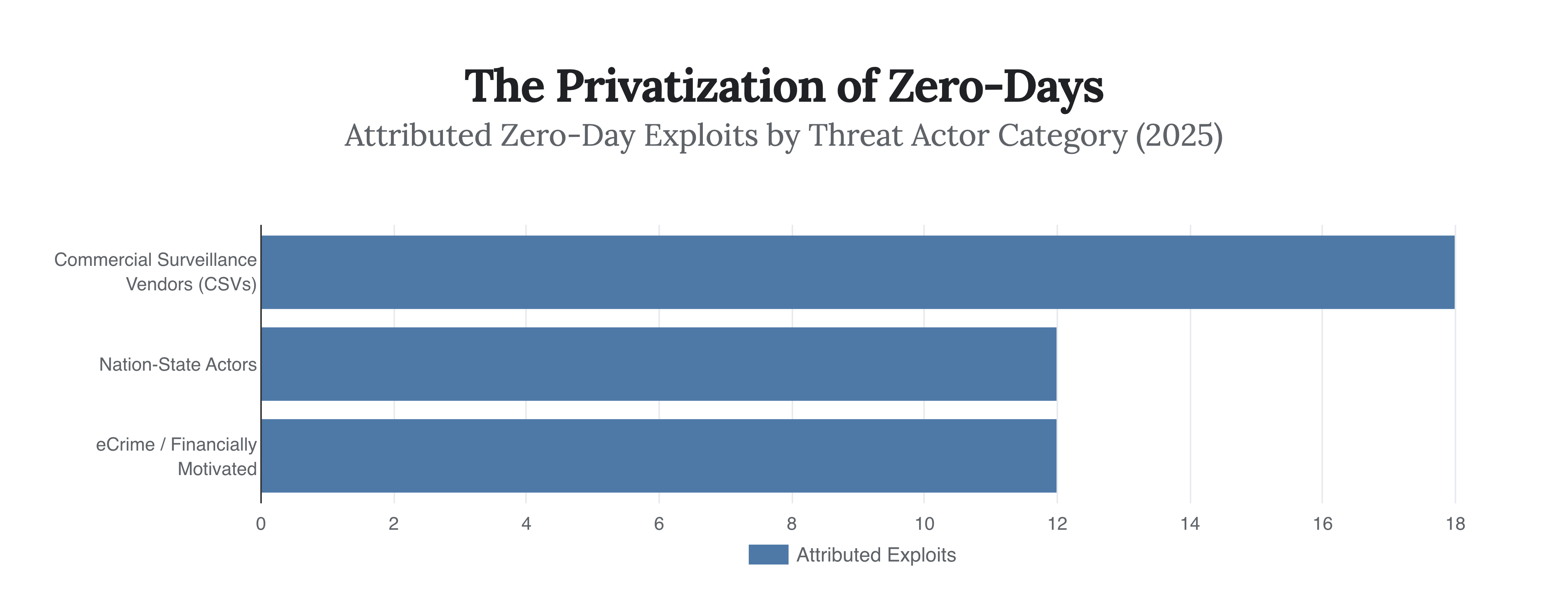 In 2025, security researchers tracked 90 zero-day vulnerabilities actively exploited in the wild. However, the source of these exploits marked a watershed moment in the history of cyber warfare. For the first time, Commercial Surveillance Vendors (CSVs)—private companies that legally develop and sell military-grade spyware to government clients worldwide—surpassed traditional state-sponsored groups in attributed zero-day exploitation. CSVs were responsible for 18 attributed exploits, compared to just 12 from nation-state actors.