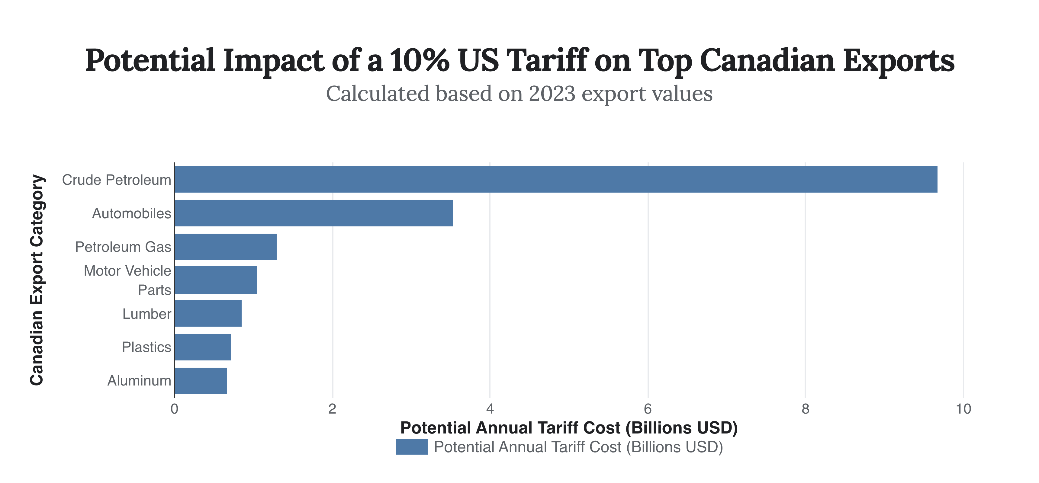 The chart above visualizes the potential annual cost a 10% tariff would impose on Canada’s leading exports to the United States, based on 2023 data. The energy sector, particularly crude petroleum, faces the most significant exposure, with a potential new cost of nearly $10 billion. The highly integrated auto industry, a backbone of manufacturing in provinces like Ontario, would also be severely hit, facing billions in new tariffs on both finished cars and essential parts.