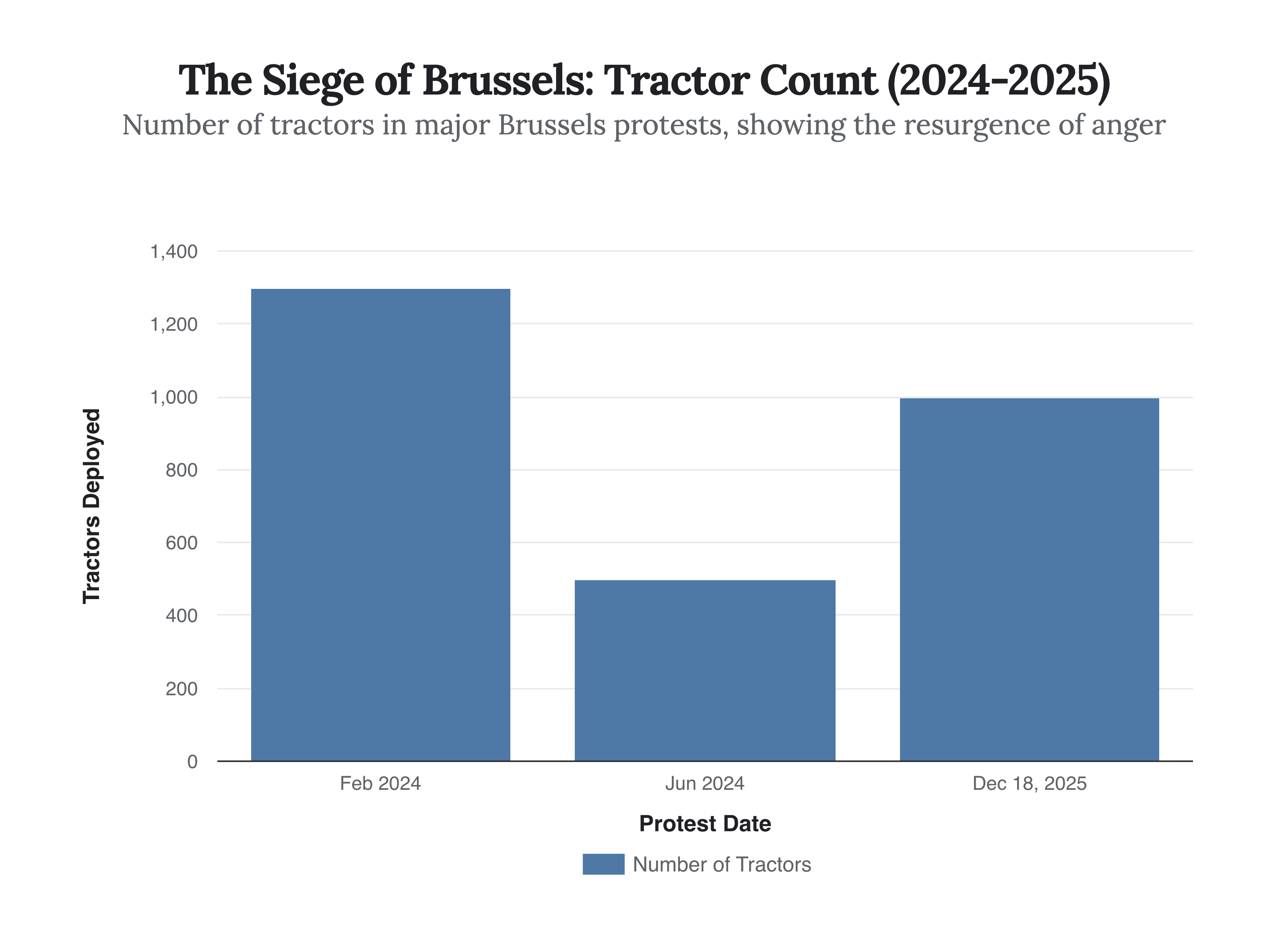 On Thursday, December 18, the European Quarter of Brussels did not smell of waffles or chocolate. It smelled of burning rubber, manure, and tear gas. In what police described as a “turbulent” siege, nearly 1,000 tractors gridlocked the capital, ripping up street signs and setting fires in Place du Luxembourg. While the images of black smoke billowing against the glass facades of EU institutions made global headlines, the true story of this revolt isn’t about traffic jams. It is about a single, terrifying number that has pushed Europe’s agricultural sector to the brink.