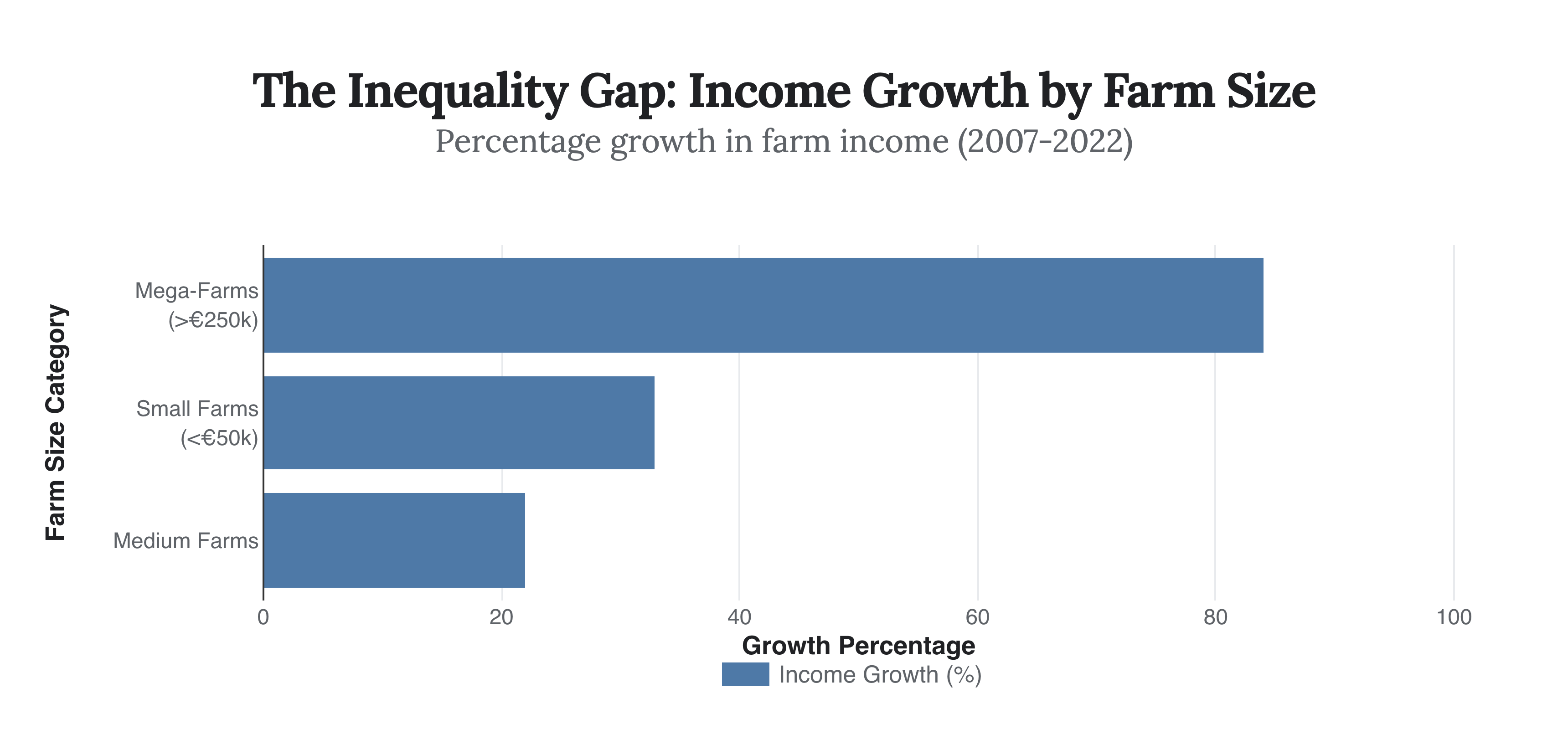 The anger in Brussels is also fueled by a widening inequality gap. While the agricultural sector as a whole has faced rising costs, the pain is not shared equally. Data reveals a stark divergence in the fortunes of mega-farms versus small family holdings. Between 2007 and 2022, income for the largest “mega-farms” (those with over €250,000 in output) surged by 84%, while small-scale farms saw much more modest gains, often failing to keep pace with inflation.