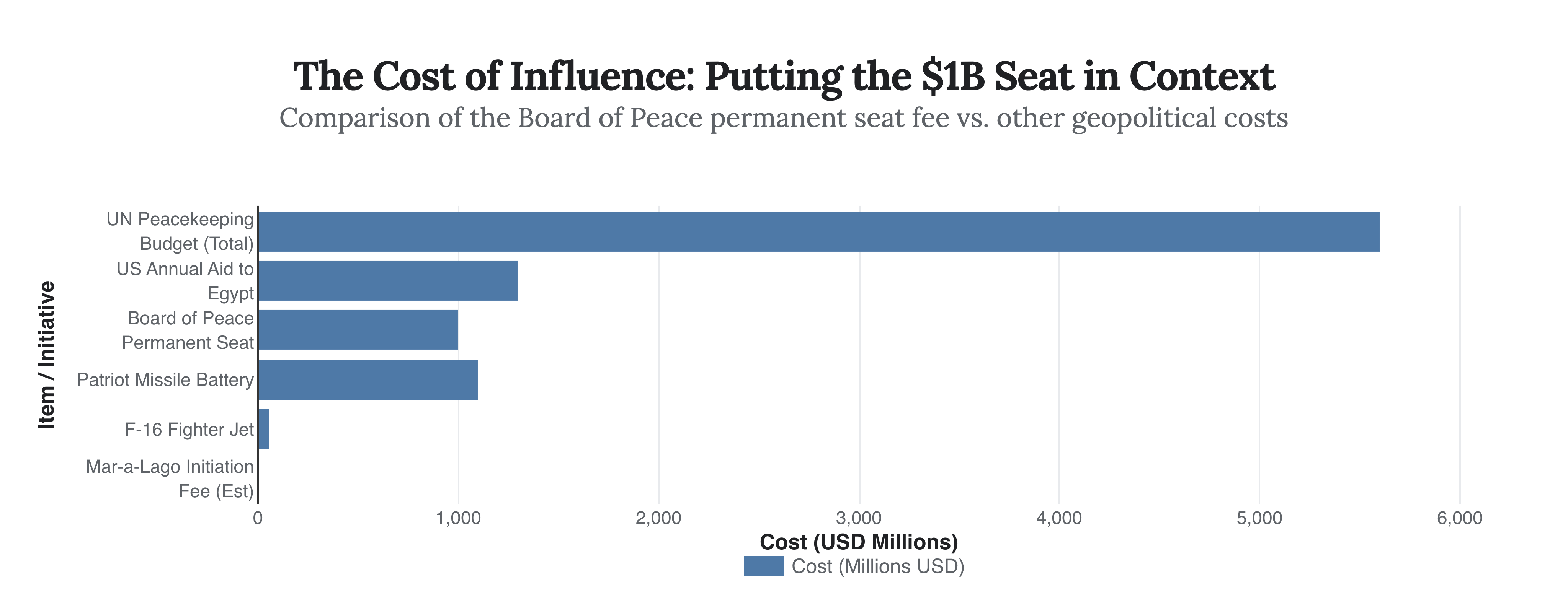 The $1 billion “permanent seat” fee is the most striking innovation. As shown in the comparison chart, the price of admission is roughly equivalent to the cost of a Patriot missile battery or nearly 80% of the United States’ entire annual aid package to Egypt. By monetizing the seat, the administration has created a high-barrier club that filters out nations unwilling—or unable—to pay for access. It also creates an independent funding stream that bypasses Congressional appropriations, giving the Board autonomy that traditional State Department initiatives lack.