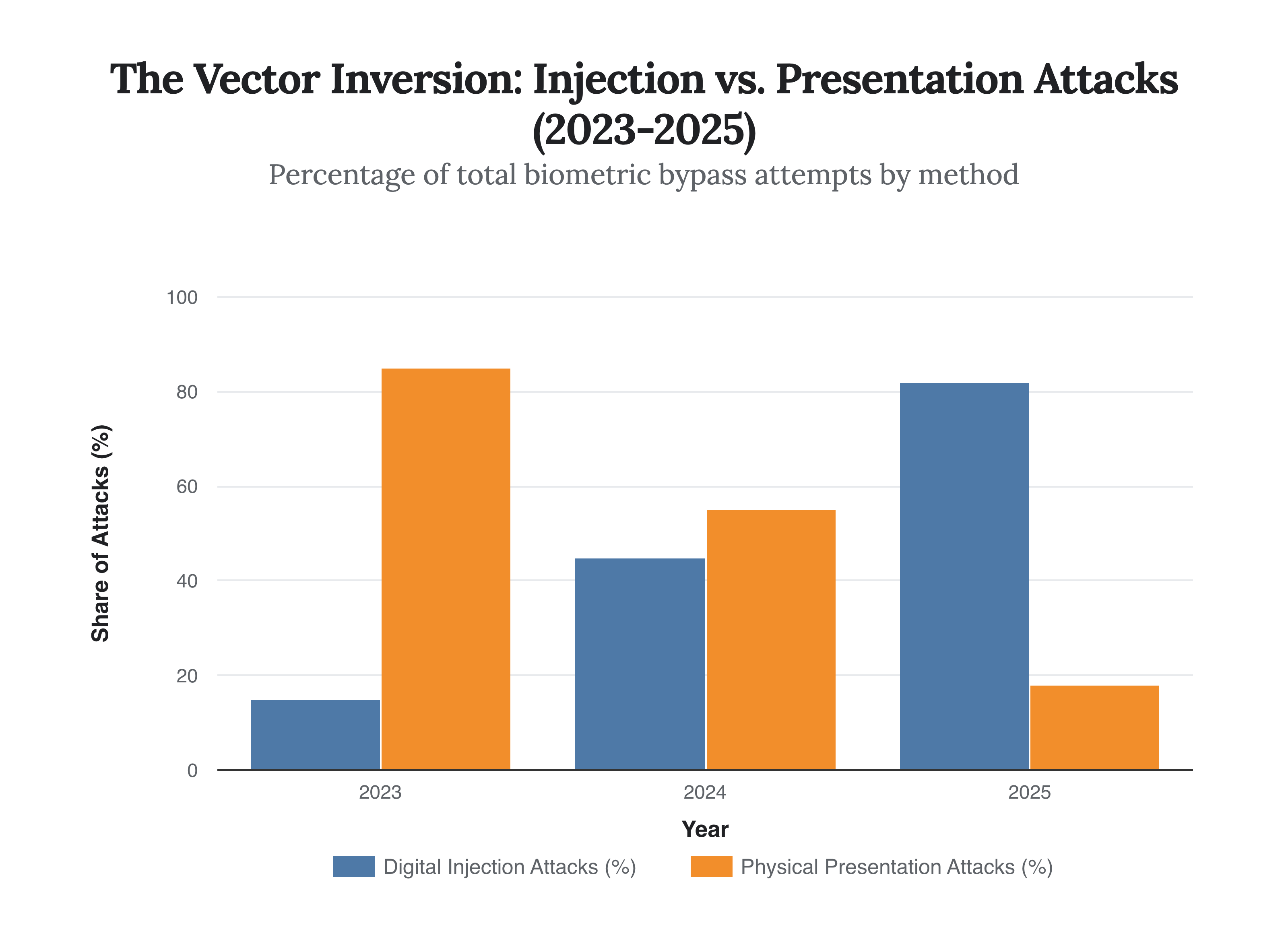 In an injection attack, the physical camera lens is bypassed entirely. Malicious code injects pre-rendered or real-time synthetic media directly into the data stream. The security system “sees” the face it expects because the data feed itself has been hijacked. Our analysis of 2025 attack vectors shows a complete inversion of the threat landscape.