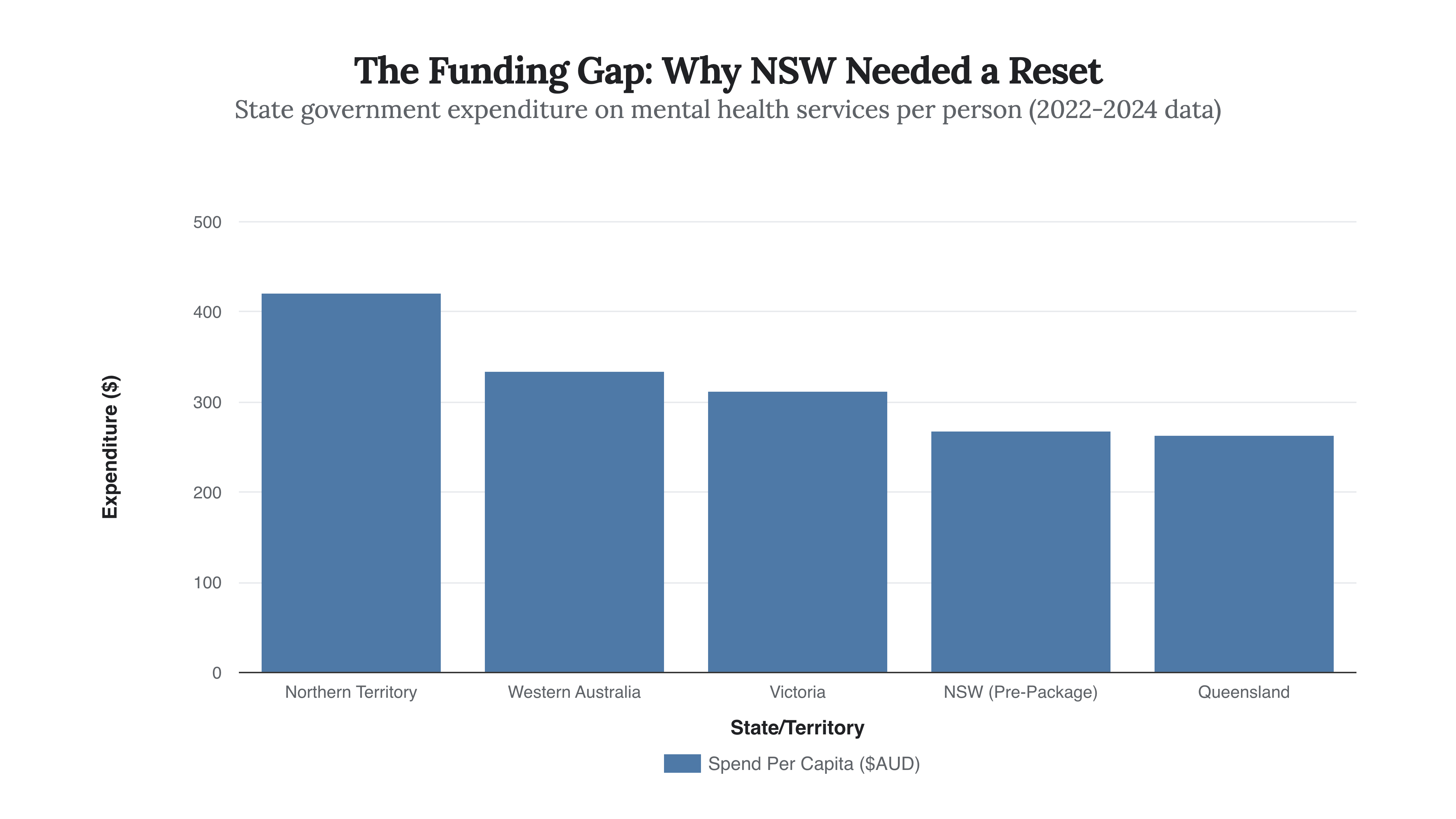 As the chart above illustrates, New South Wales had been trailing significantly behind other territories in per-capita mental health spending prior to the attack. The $111 million injection—allocated primarily for community mental health teams, outreach staff, and a “single front door” digital access point—was not just a reaction; it was a necessary correction to bring the state closer to the national standard.