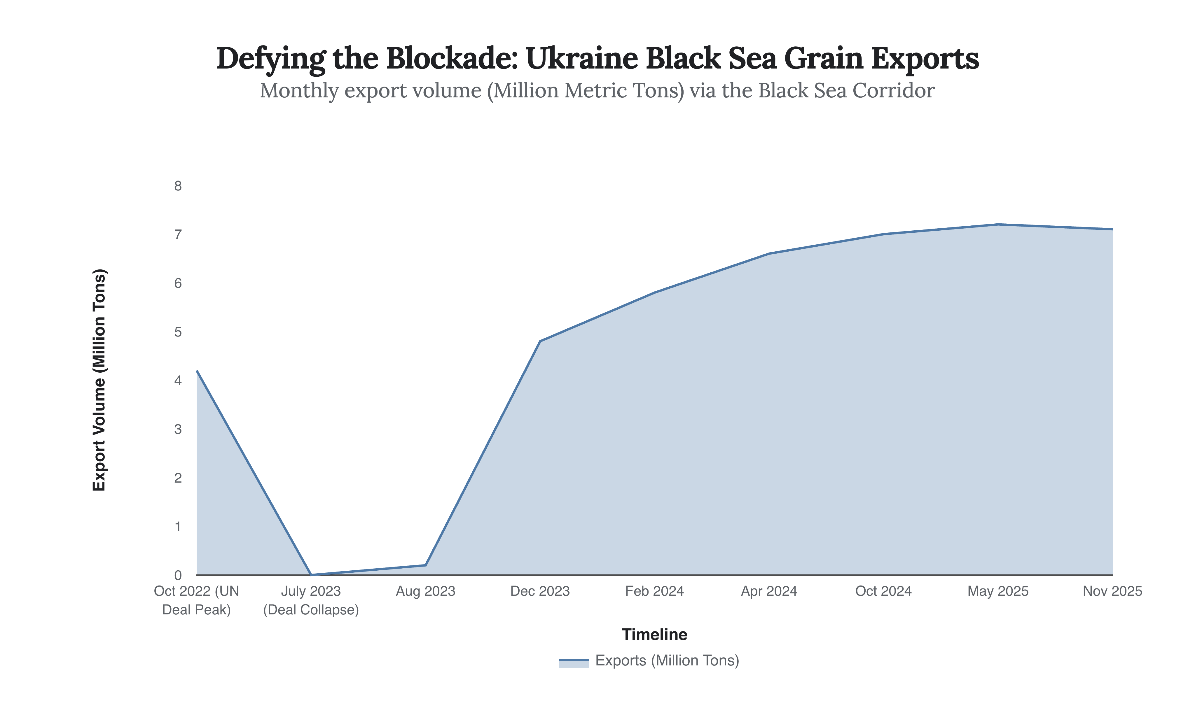 As the data shows, the “drone corridor” has not only replaced the UN-brokered deal but surpassed it. By April 2024, exports hit a record 6.6 million tons, a figure that has stabilized throughout 2025. This economic resilience is the direct dividend of the naval drone campaign. By denying Russia sea control, Ukraine restored its access to global markets.