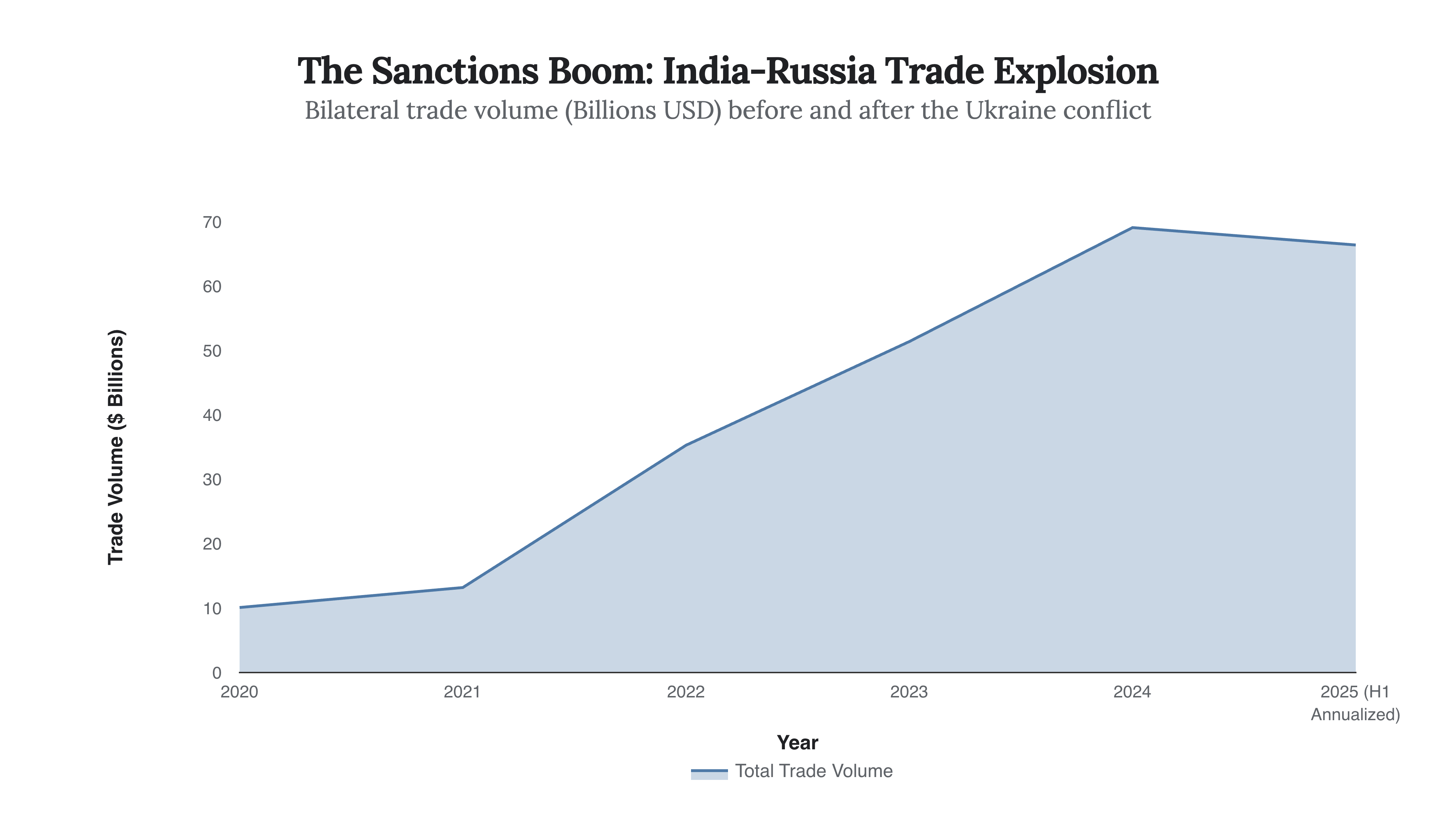 The chart above captures one of the most dramatic pivots in modern economic history. Before 2022, Russia was a marginal trading partner for India, languishing behind nations like Belgium and Nigeria. Today, it is a titan, driven almost exclusively by India’s voracious appetite for discounted energy.