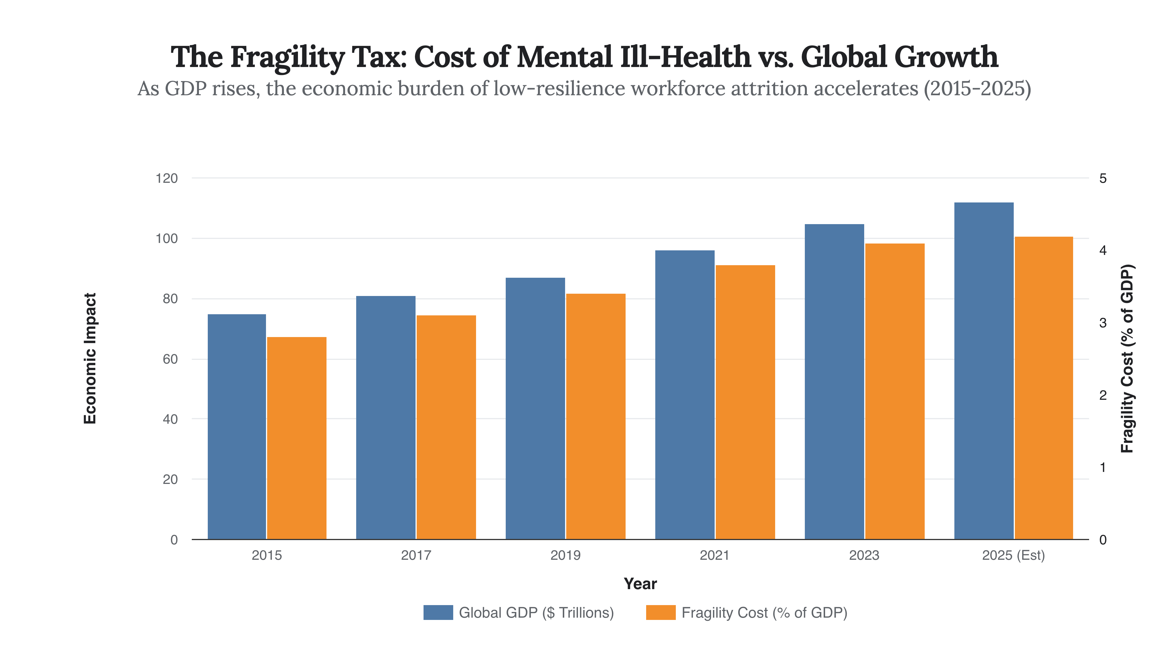 The chart above visualizes the diverging trajectories. While global wealth increases, an increasing percentage of that wealth is being recaptured by the costs of lost productivity, turnover, and healthcare associated with low resilience. We are getting richer, but we are becoming exponentially more expensive to maintain.