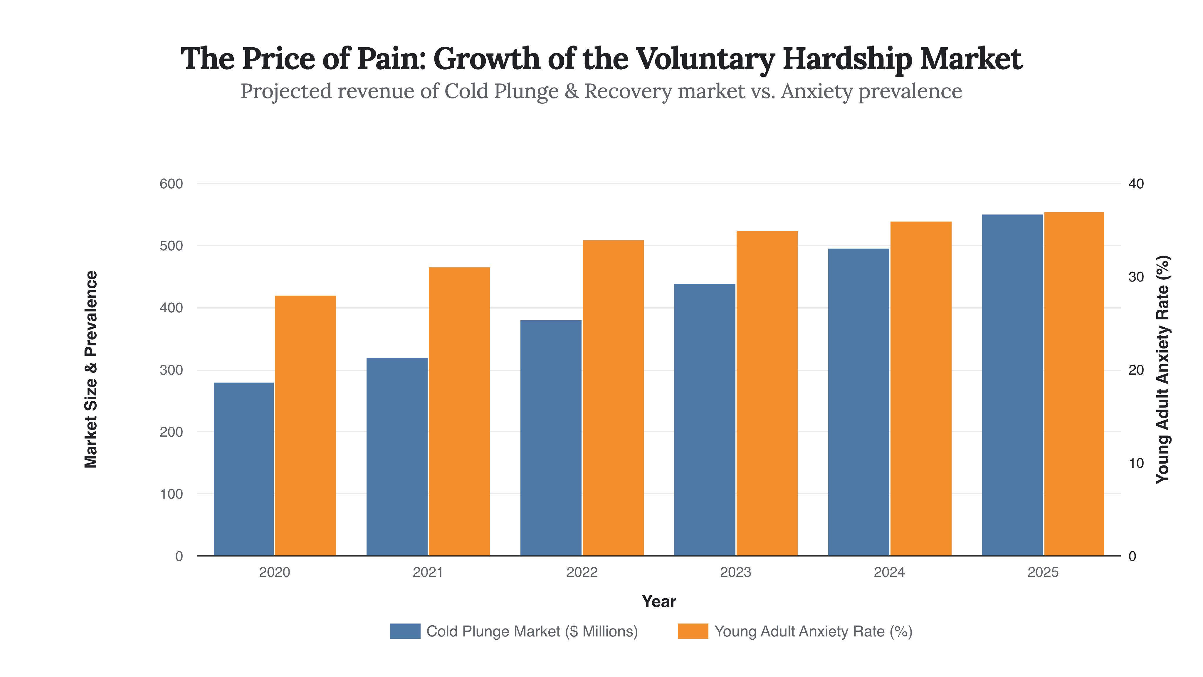 This correlation is vital. As anxiety (fragility) rises, the market demand for controlled suffering (resilience training) rises in tandem. The market is attempting to correct the biological error of the comfort crisis.