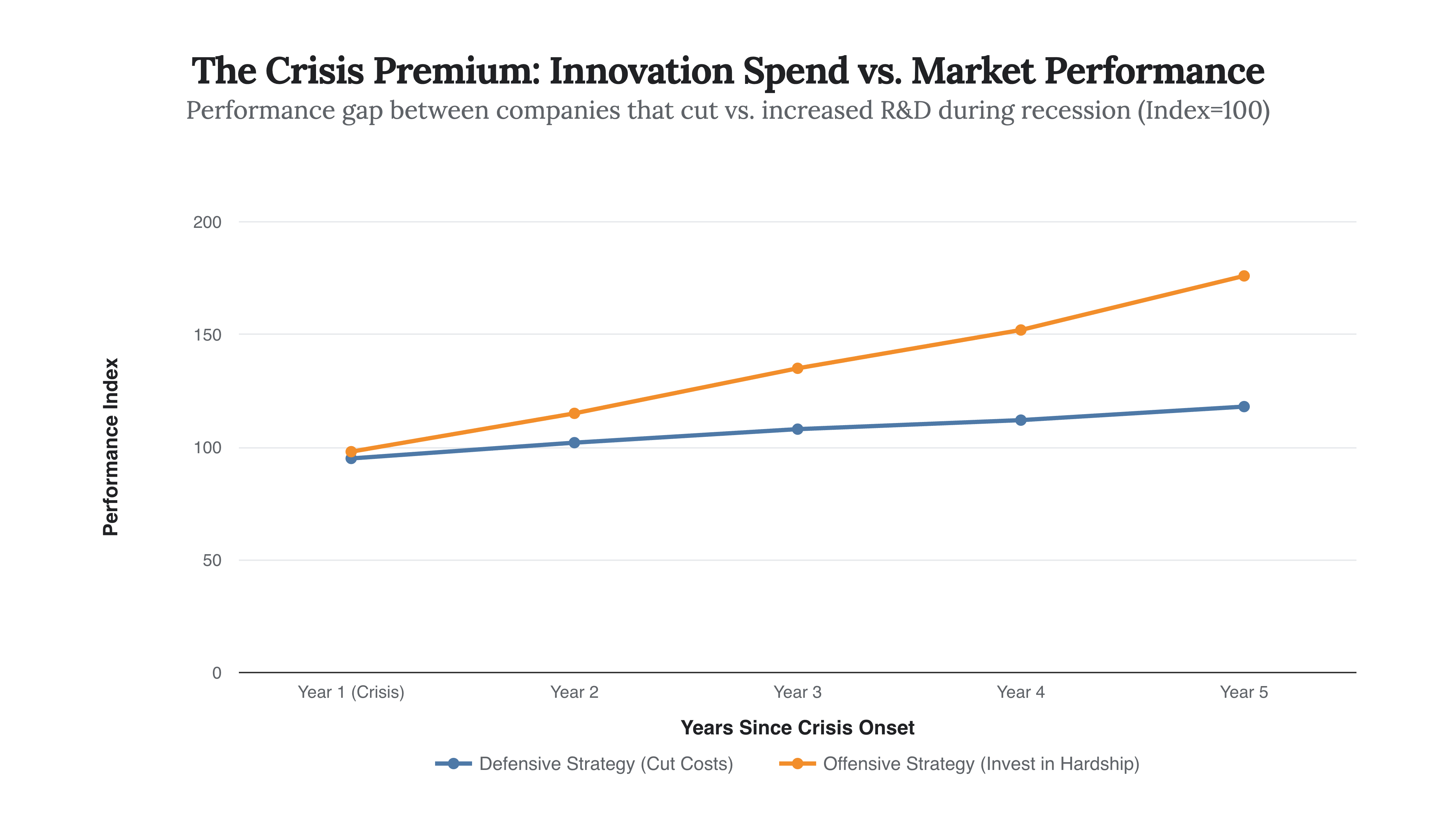 In biology, hormesis is the phenomenon where low-dose stress stimulates beneficial adaptive responses. In business, this principle is quantifiable. Historical data from the 2008 recession and preliminary data from the post-2020 volatility period confirms that organizations that “lean into” suffering—voluntarily increasing R&D and innovation spend during downturns—capture a massive long-term premium.