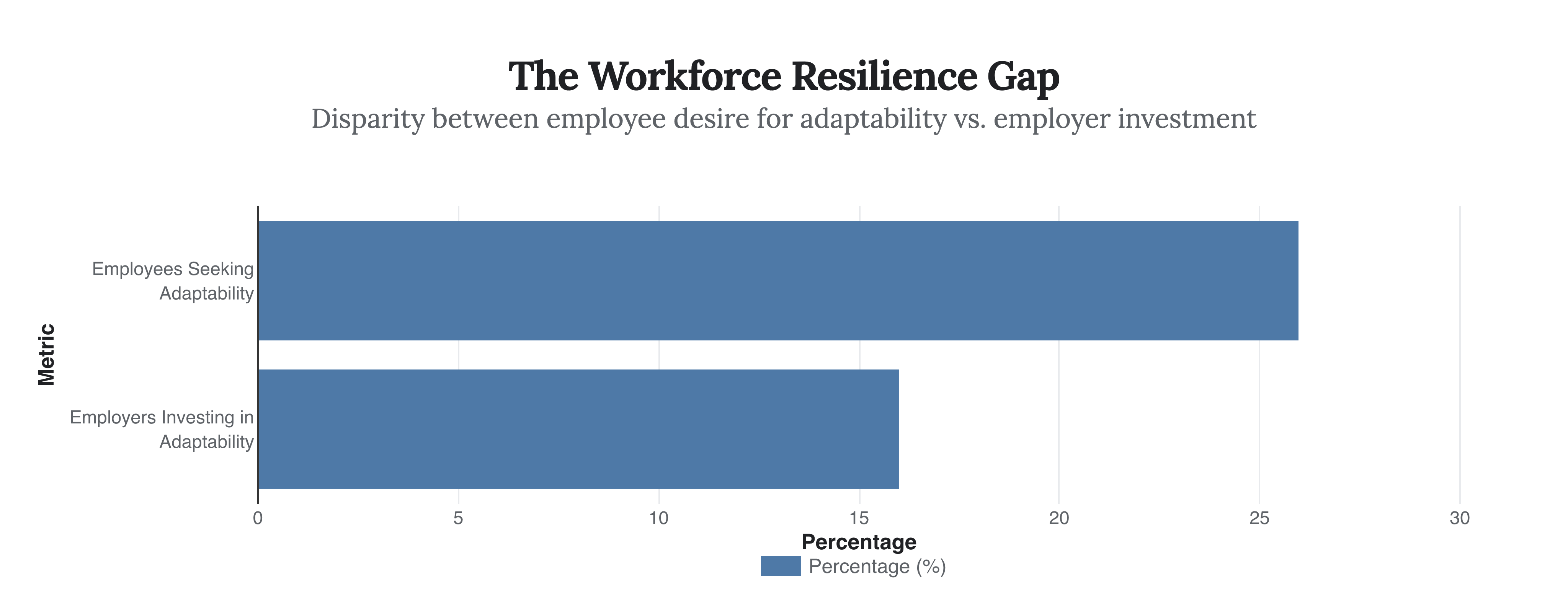 The gap above highlights the immediate opportunity. 26% of the workforce actively craves the tools to adapt (to suffer well and grow), yet only 16% of employers are investing in these frameworks. Closing this 10% gap is the lowest-hanging fruit for immediate ROI in human capital.