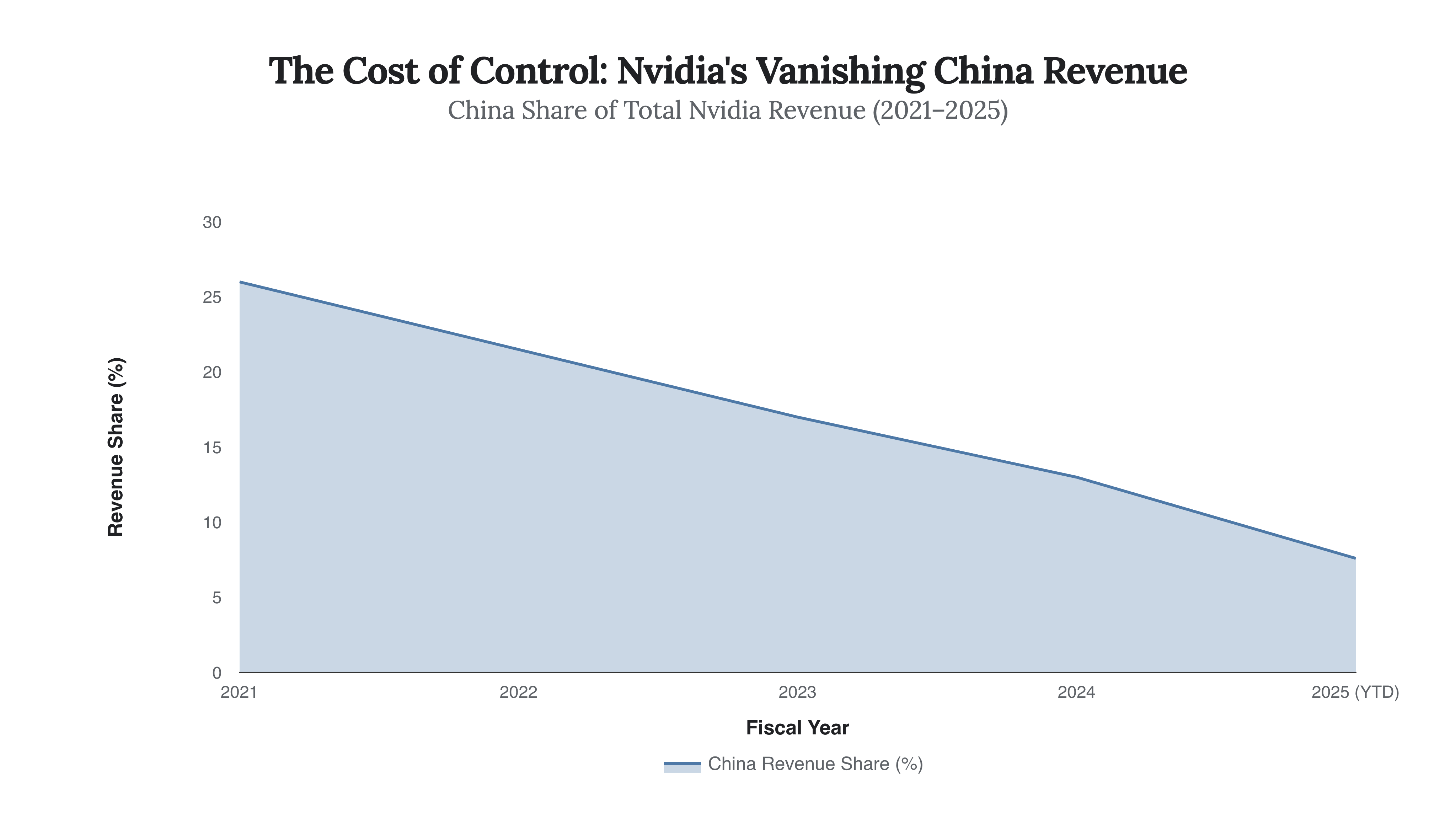 For Nvidia, the policy shift comes just in time to arrest a frightening decline in what was once its most lucrative market. In 2021, China accounted for over a quarter of Nvidia’s total revenue. By late 2025, that figure had collapsed to under 8%, as uncertainty and domestic substitution took hold. In the third quarter of 2025 alone, sales of the H20 chip reportedly flatlined to near zero as customers anticipated either a crackdown or a breakthrough.