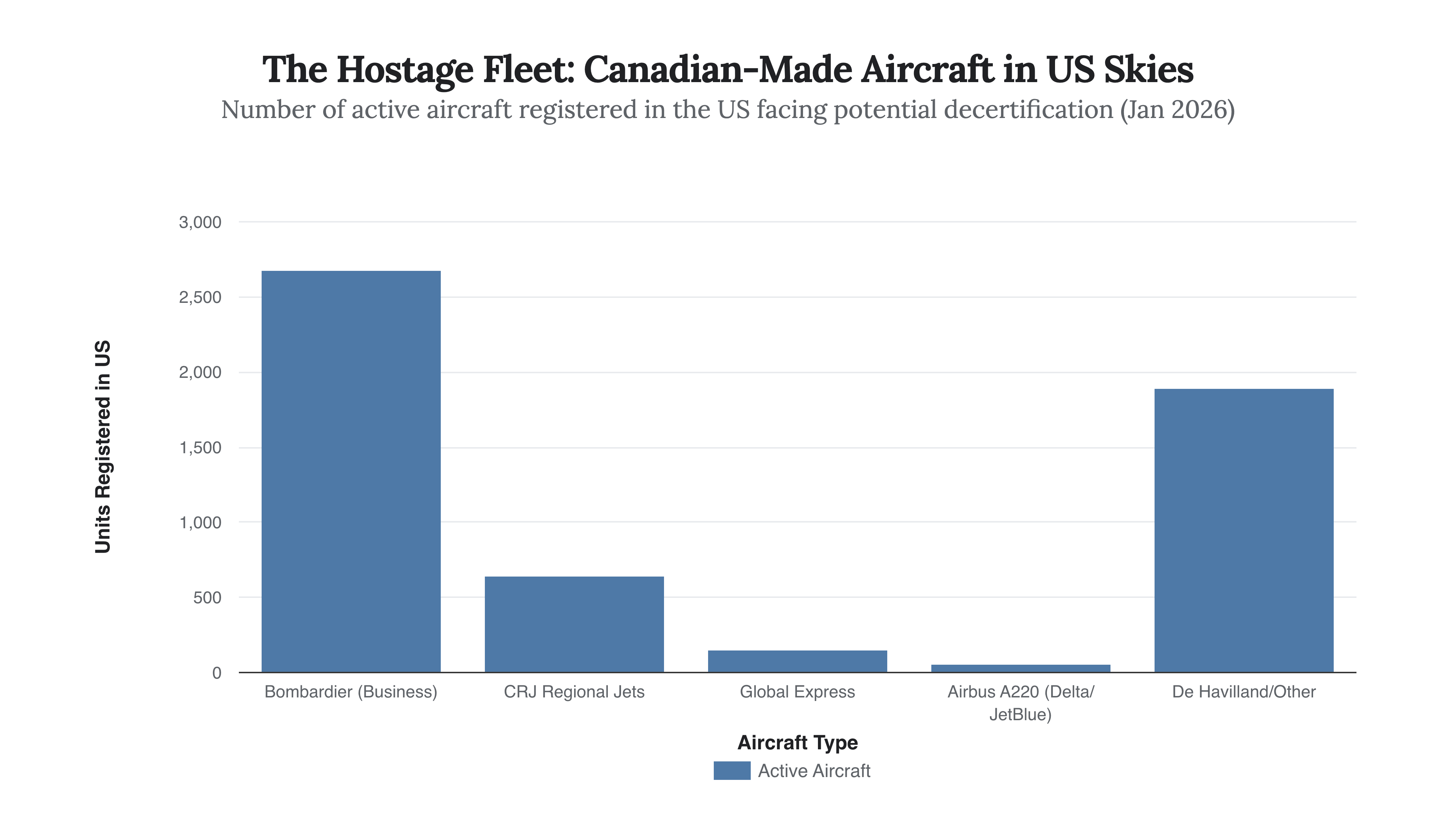 As the chart above illustrates, the collateral damage of this policy would be immediate and severe. According to aviation analytics firm Cirium, there are approximately 5,425 Canadian-assembled aircraft currently registered in the United States. While Trump specifically named the Bombardier Global Express—a direct competitor to the US-made Gulfstream—the blanket wording of his threat ensnares the backbone of America’s regional aviation.