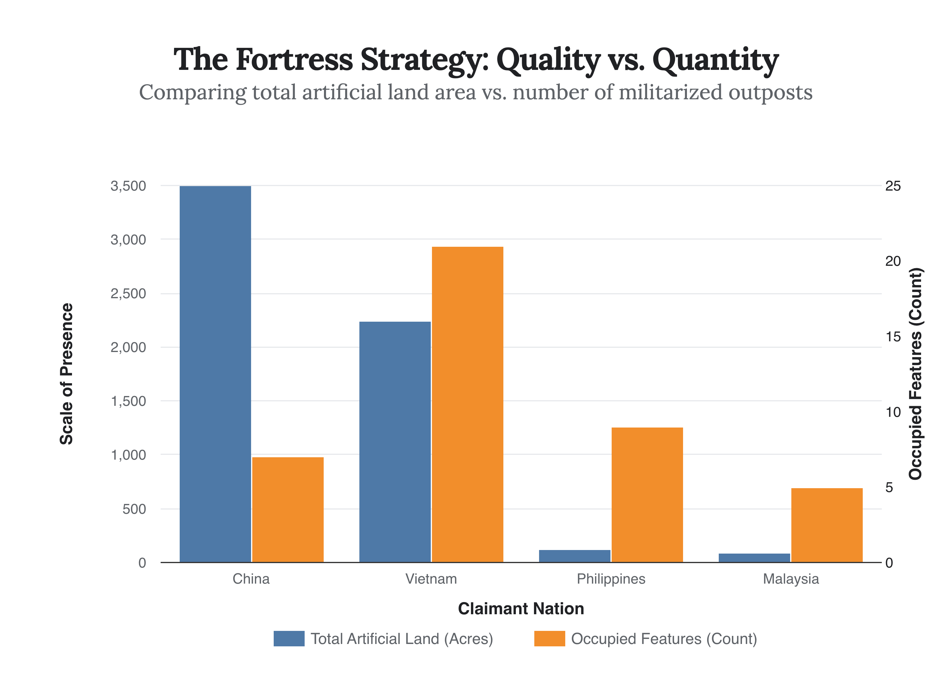 As the comparison above shows, the disparity between the two primary builders is shrinking. While China still dominates in total acreage (approx. 3,500 acres), Vietnam has now reached nearly 64% of that total, a figure that would have seemed impossible just five years ago. More importantly, Vietnam’s “Archipelago Strategy” spreads this risk across 21 different features, compared to China’s 7. This distribution makes the Vietnamese network harder to neutralize in a hypothetical conflict, creating a “porcupine” defense of hardened, scattered points.