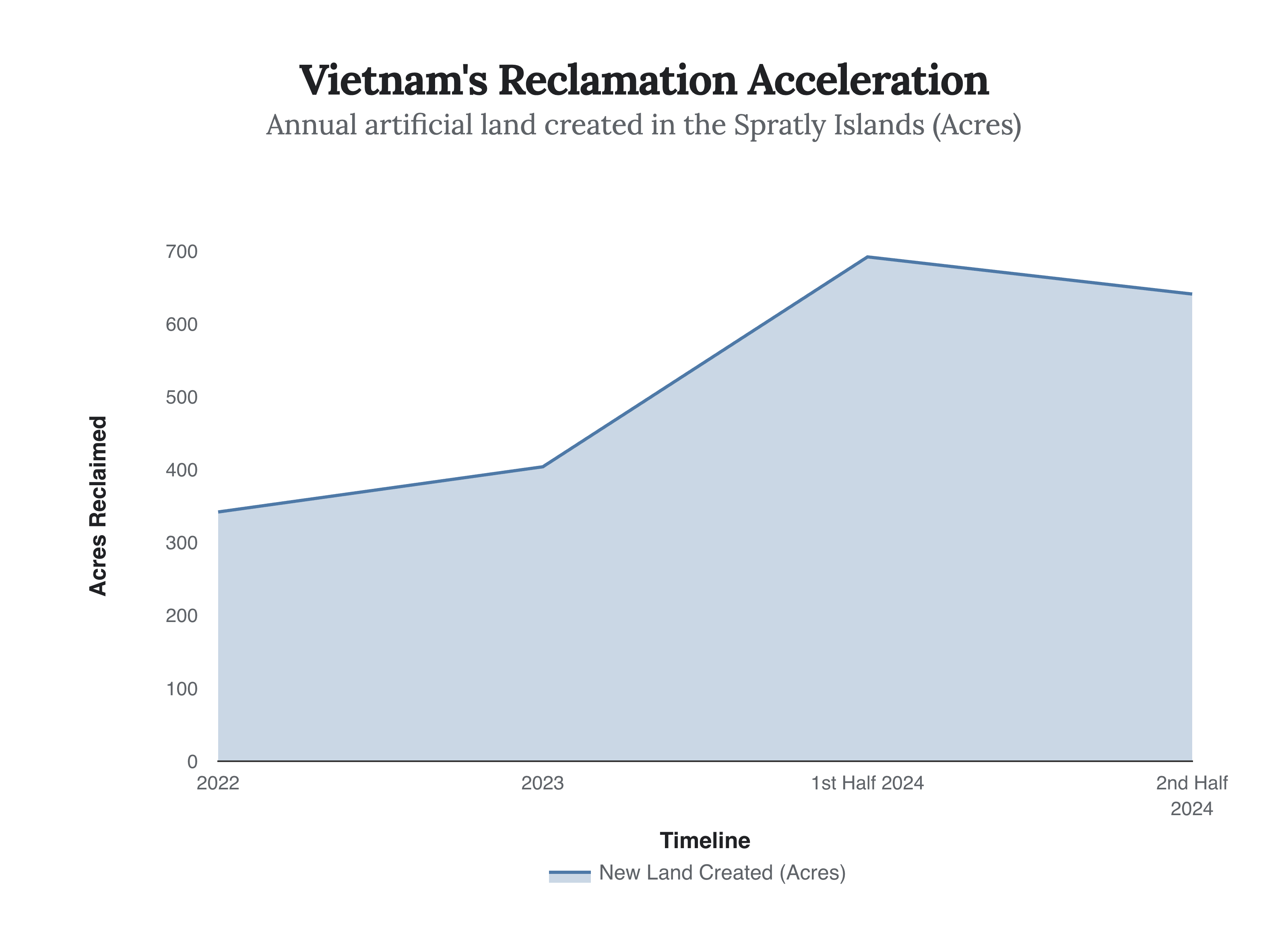 The chart above illustrates the dramatic “hockey stick” growth in Vietnam’s dredging operations. After years of modest improvements, Hanoi initiated a breakneck expansion campaign in late 2023 that continued through 2024. This surge is not accidental. It is a calculated response to the militarization of the region, ensuring that Vietnam’s claims are backed not just by historical maps, but by physical reality. These new acres are being paved immediately—often for military logistics.