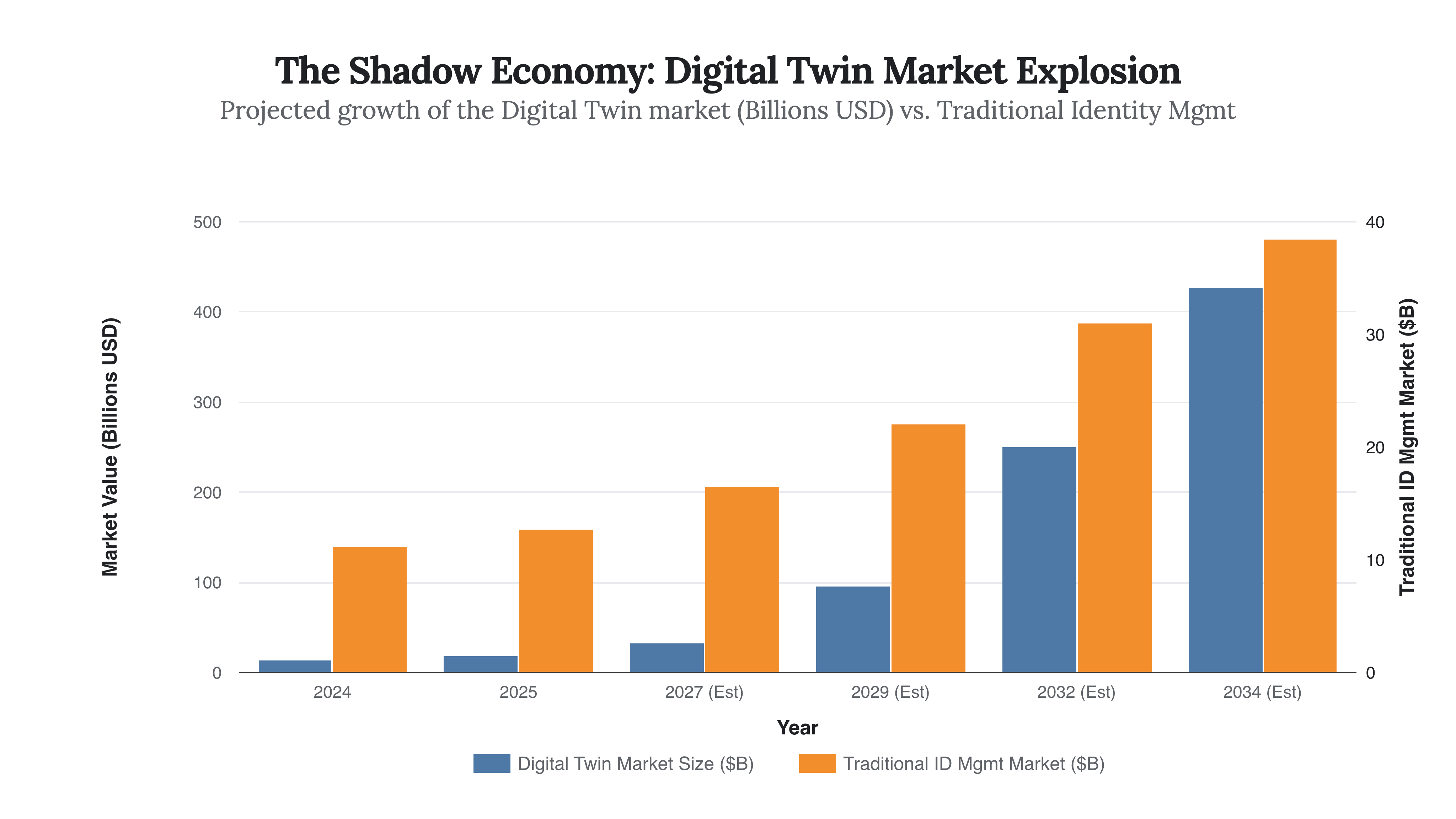 Fig 2.1: The value of simulating identity (Digital Twins) is decoupling from the value of managing identity. By 2029, the simulation market will dwarf the verification market, signaling a shift from protection to exploitation.