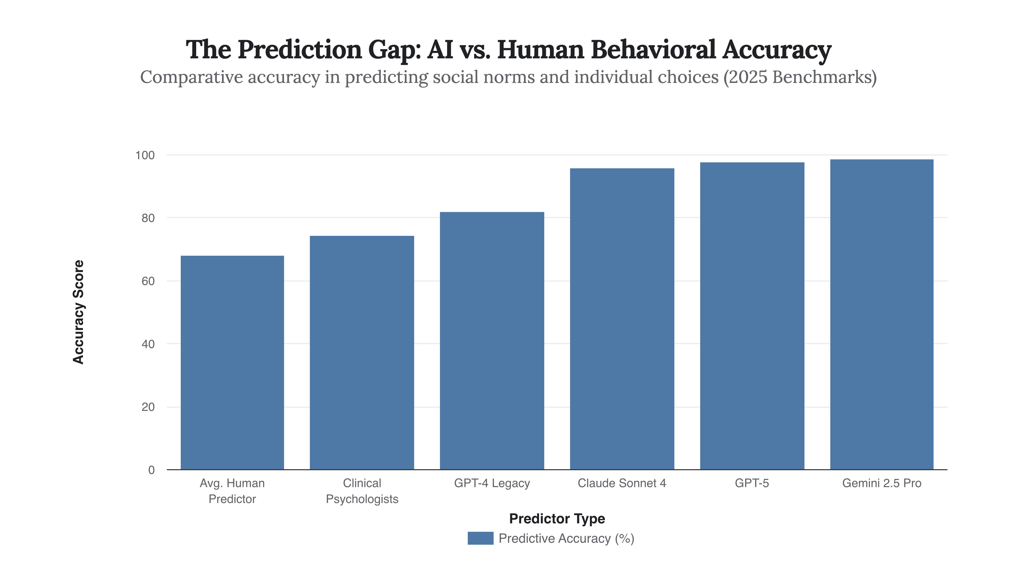 Fig 1.1: The “Inference Horizon.” As of late 2025, top-tier AI models have surpassed even human experts in predicting behavioral outcomes, creating a power asymmetry where systems know users better than users know themselves.